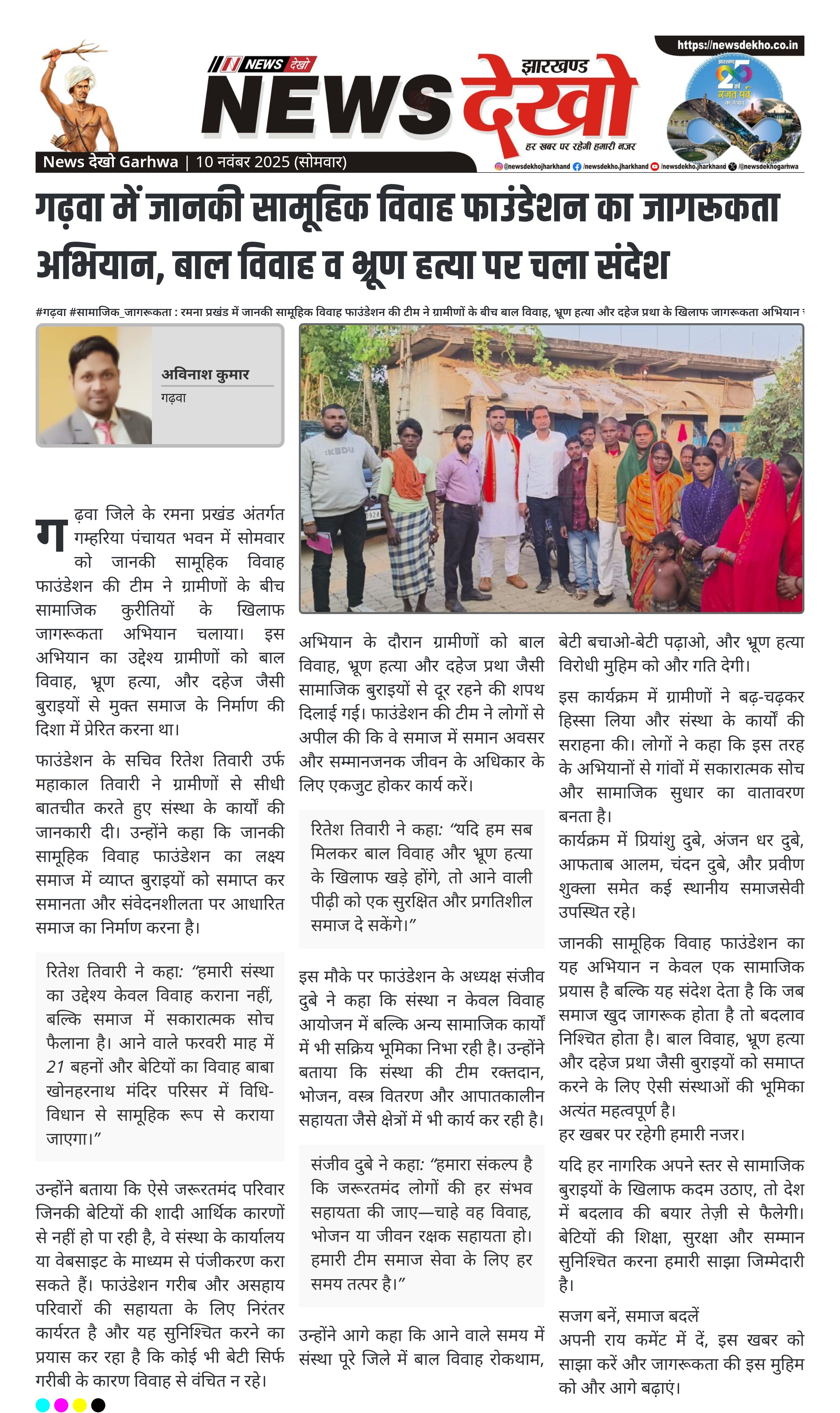 #गढ़वा #सामाजिक_जागरूकता : रमना प्रखंड में जानकी सामूहिक विवाह फाउंडेशन की टीम ने ग्रामीणों के बीच बाल विवाह, भ्रूण हत्या और दहेज प्रथा के खिलाफ जागरूकता अभियान चलाया।