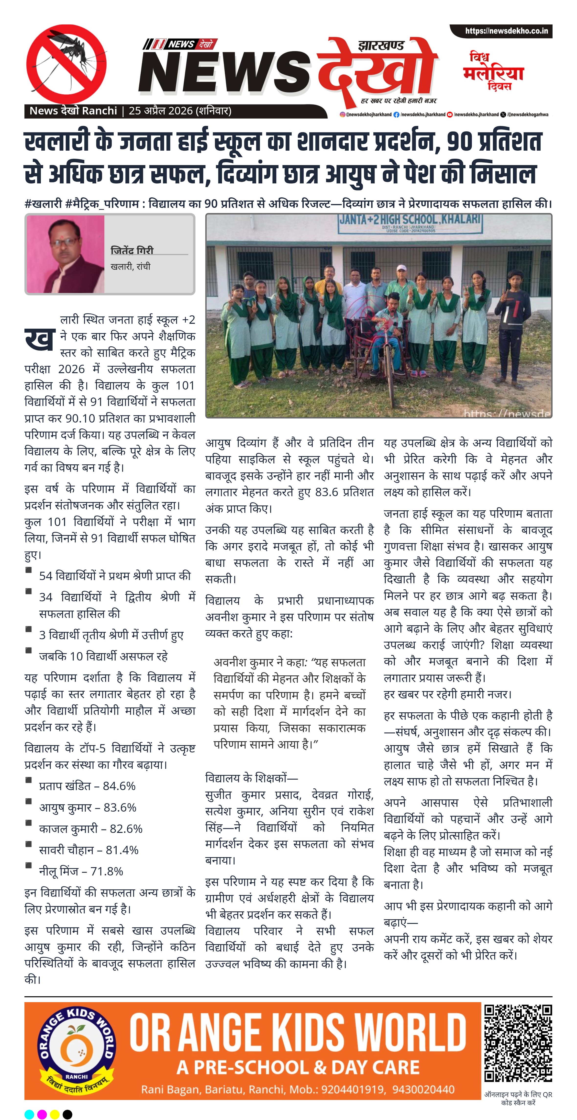 - आयुष कुमार (दिव्यांग) ने 83.6% अंक लाकर प्रेरणा दी।