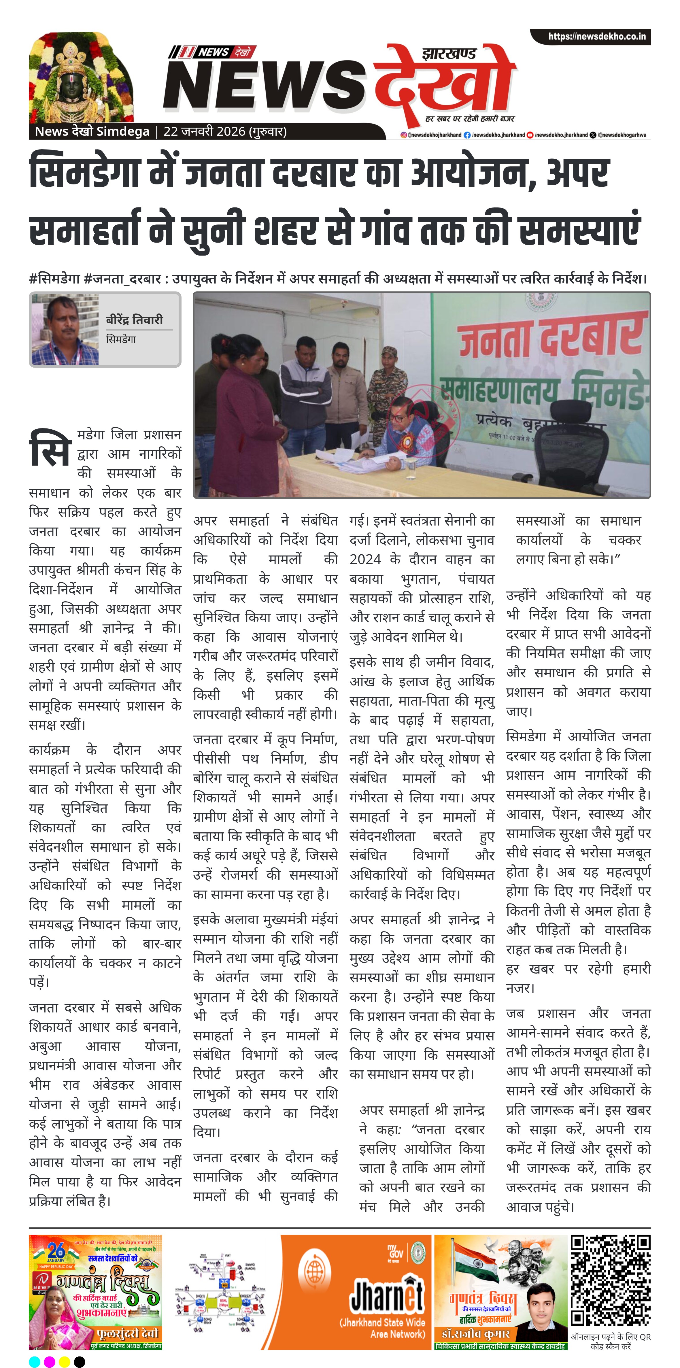 सिमडेगा जिले में आम नागरिकों की समस्याओं के त्वरित समाधान के उद्देश्य से जनता दरबार का आयोजन किया गया। उपायुक्त श्रीमती कंचन सिंह के दिशा-निर्देशन में अपर समाहर्ता श्री ज्ञानेन्द्र की अध्यक्षता में आयोजित इस दरबार में शहर एवं ग्रामीण क्षेत्रों से आए लोगों ने अपनी समस्याएं रखीं। अपर समाहर्ता ने प्रत्येक मामले को गंभीरता से सुनते हुए संबंधित विभागीय पदाधिकारियों को त्वरित निष्पादन के निर्देश दिए। जनता दरबार में आवास, पेंशन, स्वास्थ्य, भूमि विवाद और योजनाओं के भुगतान से जुड़ी शिकायतें प्रमुख रहीं।