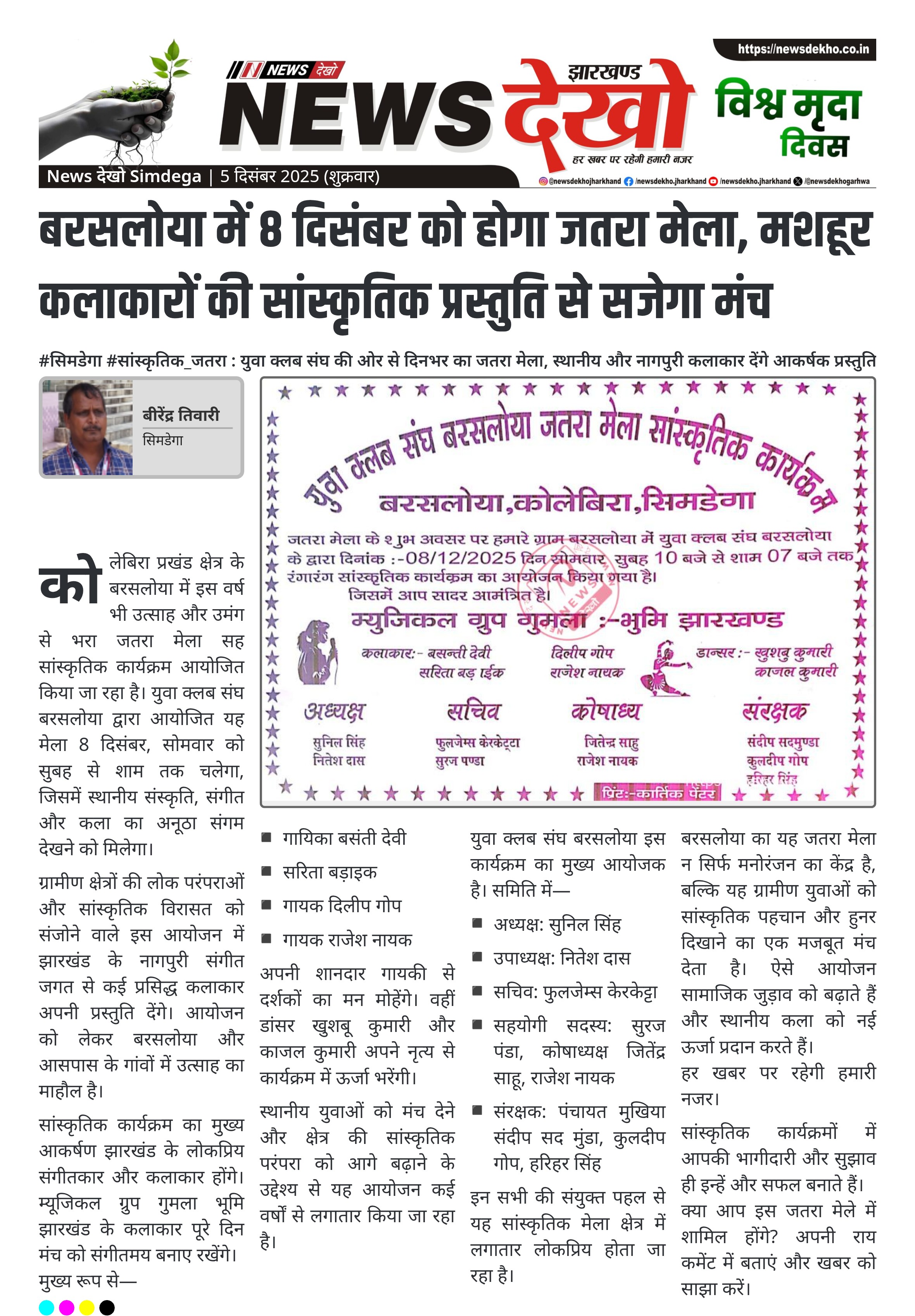 - कोलेबिरा प्रखंड के बरसलोया में 8 दिसंबर को जतरा मेला सह सांस्कृतिक कार्यक्रम का आयोजन।