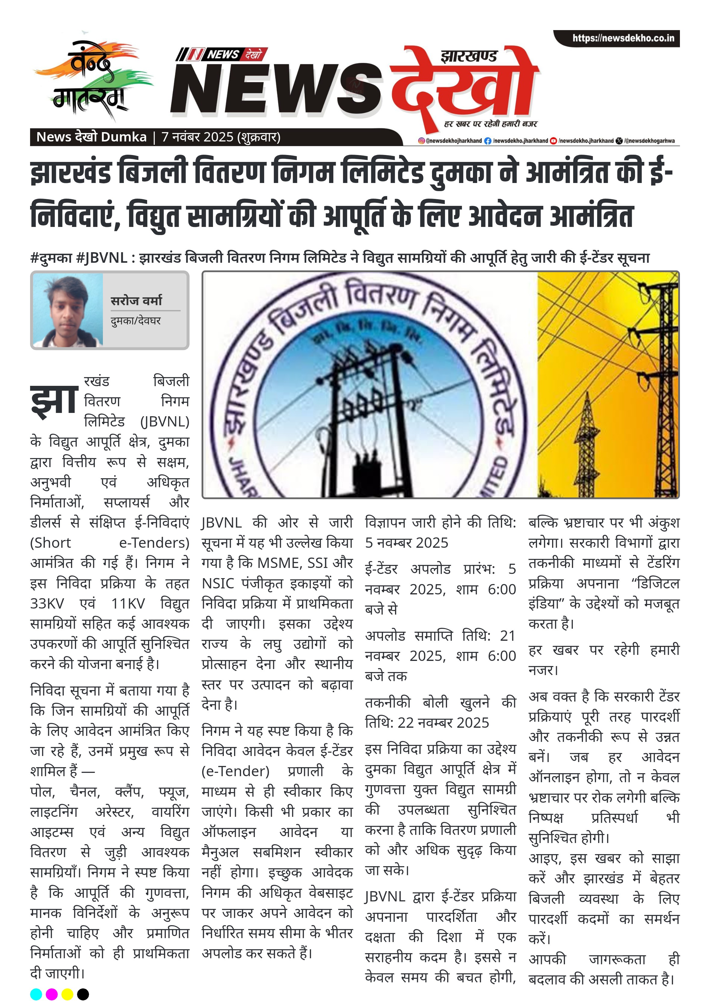 #दुमका #JBVNL : झारखंड बिजली वितरण निगम लिमिटेड ने विद्युत सामग्रियों की आपूर्ति हेतु जारी की ई-टेंडर सूचना