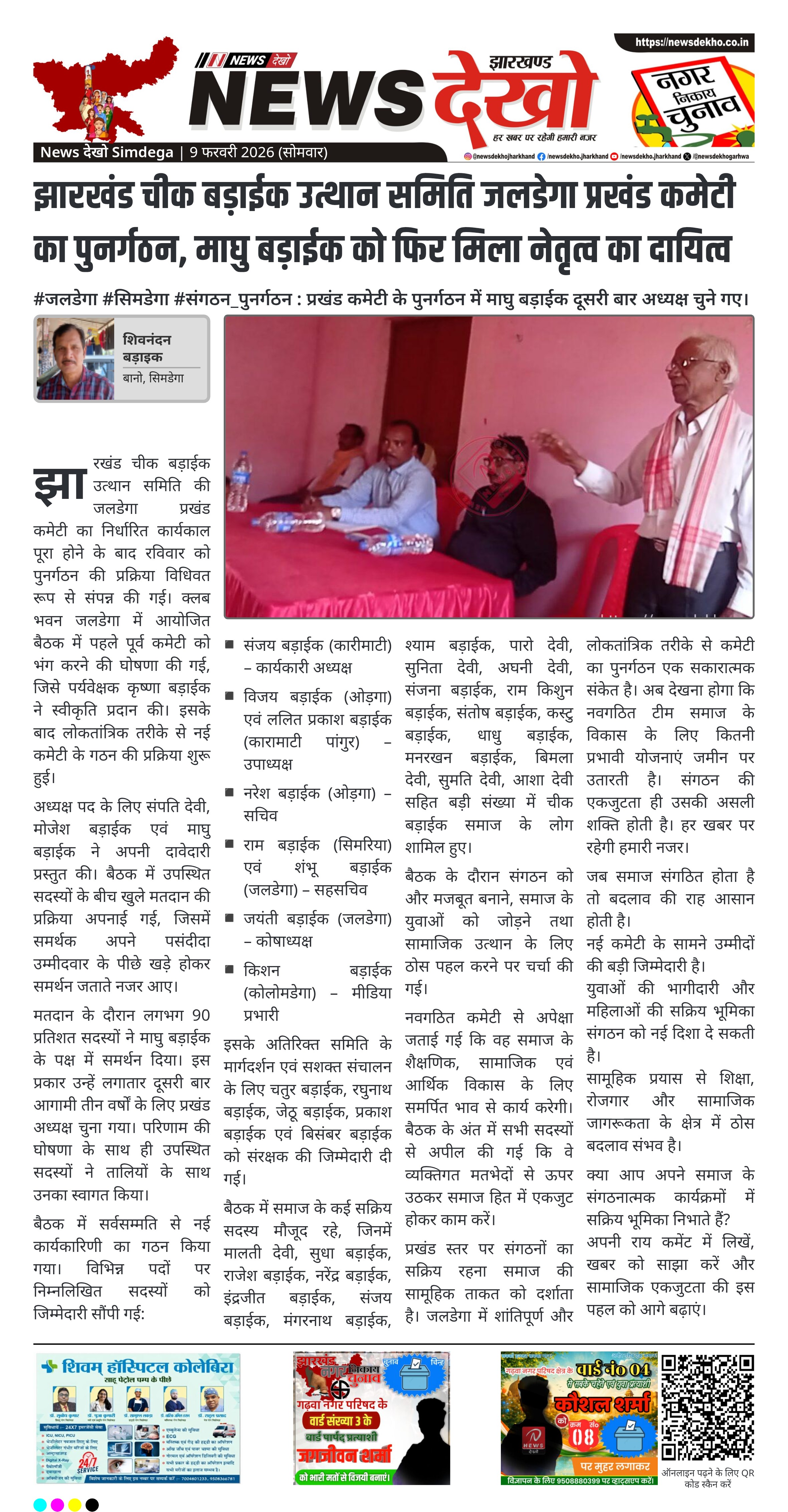 झारखंड चीक बड़ाईक उत्थान समिति की जलडेगा प्रखंड कमेटी का निर्धारित कार्यकाल पूरा होने के बाद रविवार को पुनर्गठन की प्रक्रिया विधिवत रूप से संपन्न की गई। क्लब भवन जलडेगा में आयोजित बैठक में पहले पूर्व कमेटी को भंग करने की घोषणा की गई, जिसे पर्यवेक्षक कृष्णा बड़ाईक ने स्वीकृति प्रदान की। इसके बाद लोकतांत्रिक तरीके से नई कमेटी के गठन की प्रक्रिया शुरू हुई।