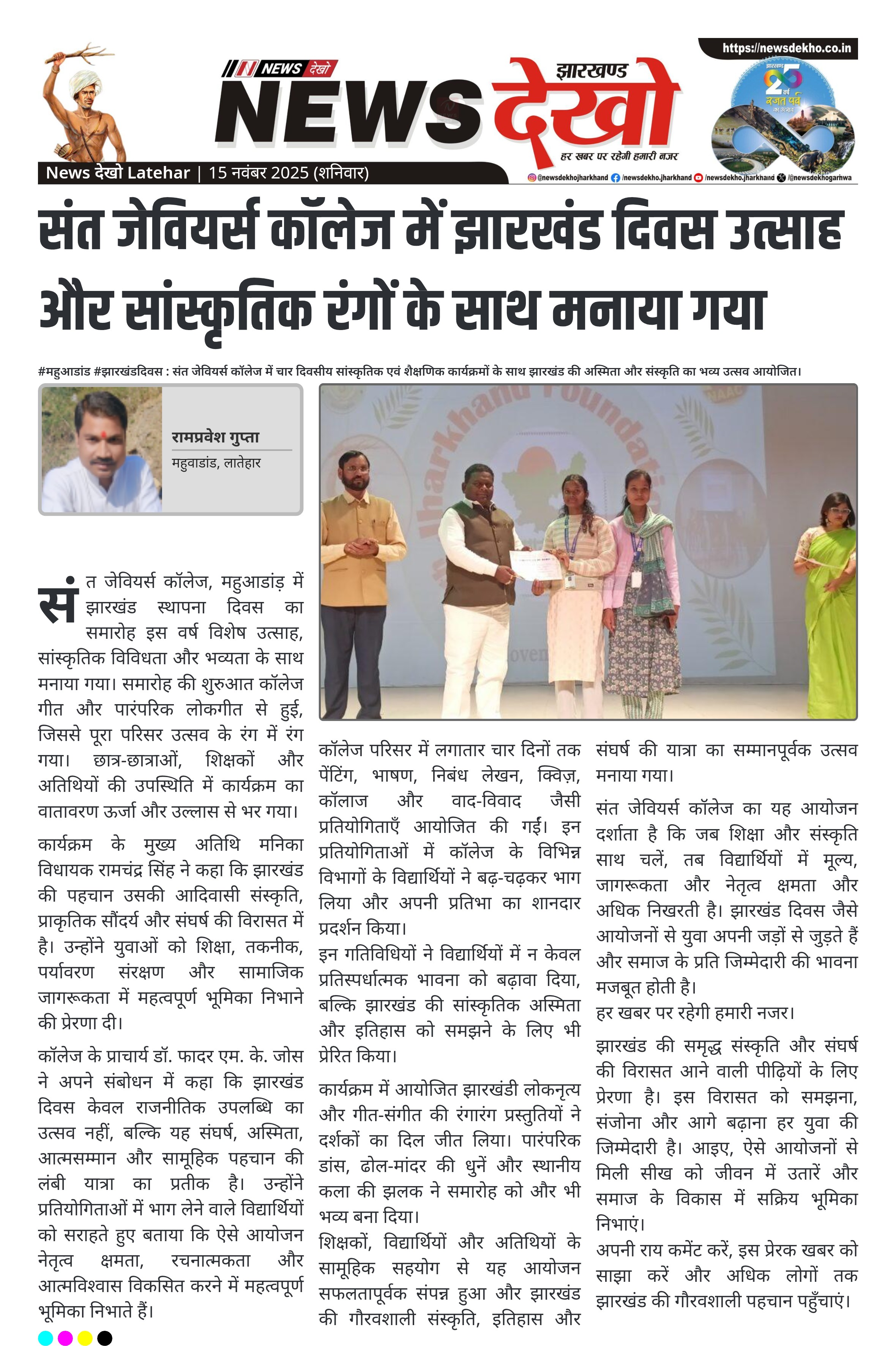 - प्राचार्य डॉ. फादर एम. के. जोस ने झारखंड दिवस को संघर्ष और अस्मिता की यात्रा का प्रतीक बताया।