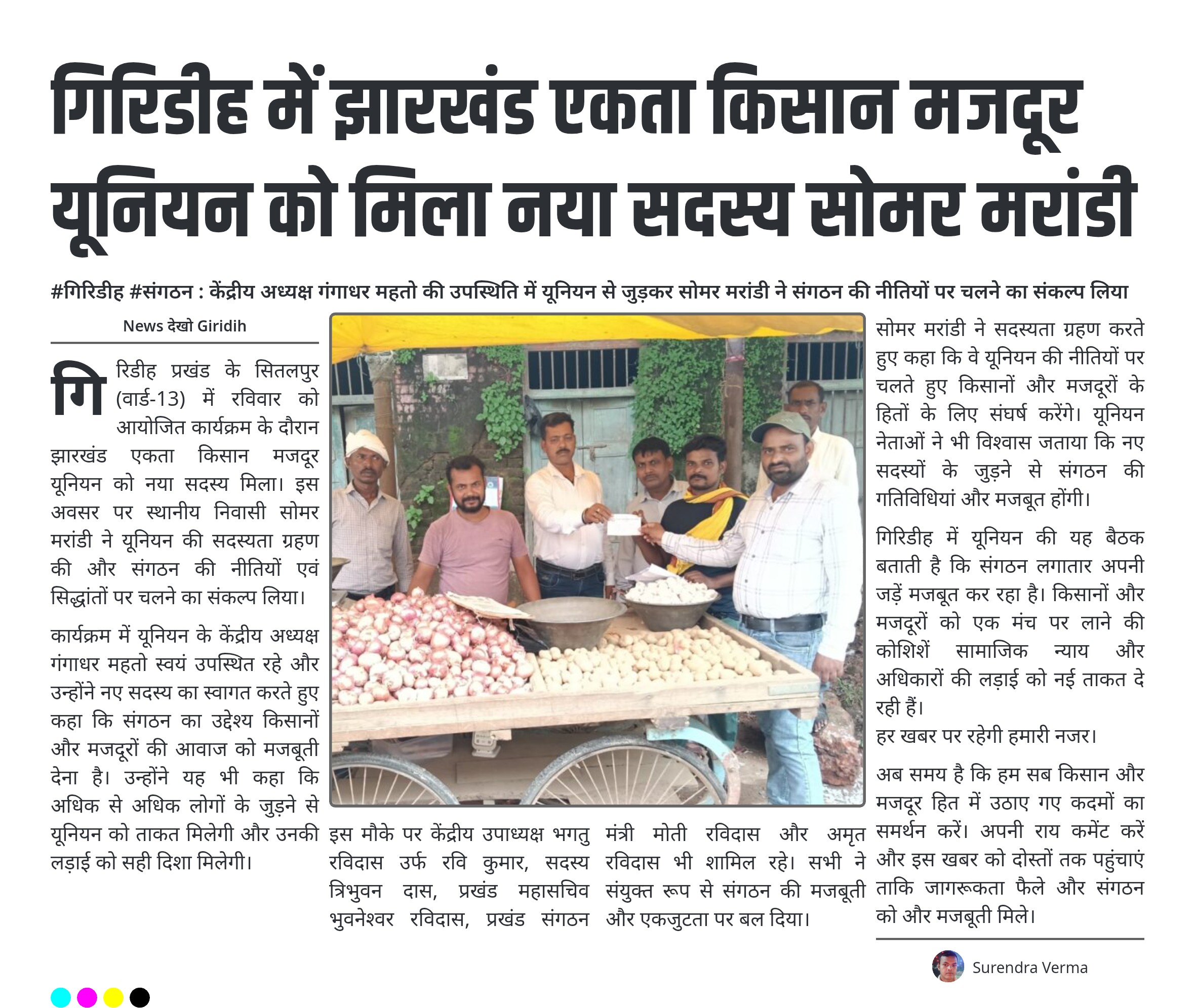 - सितलपुर वार्ड-13 निवासी सोमर मरांडी ने यूनियन की सदस्यता ग्रहण की।