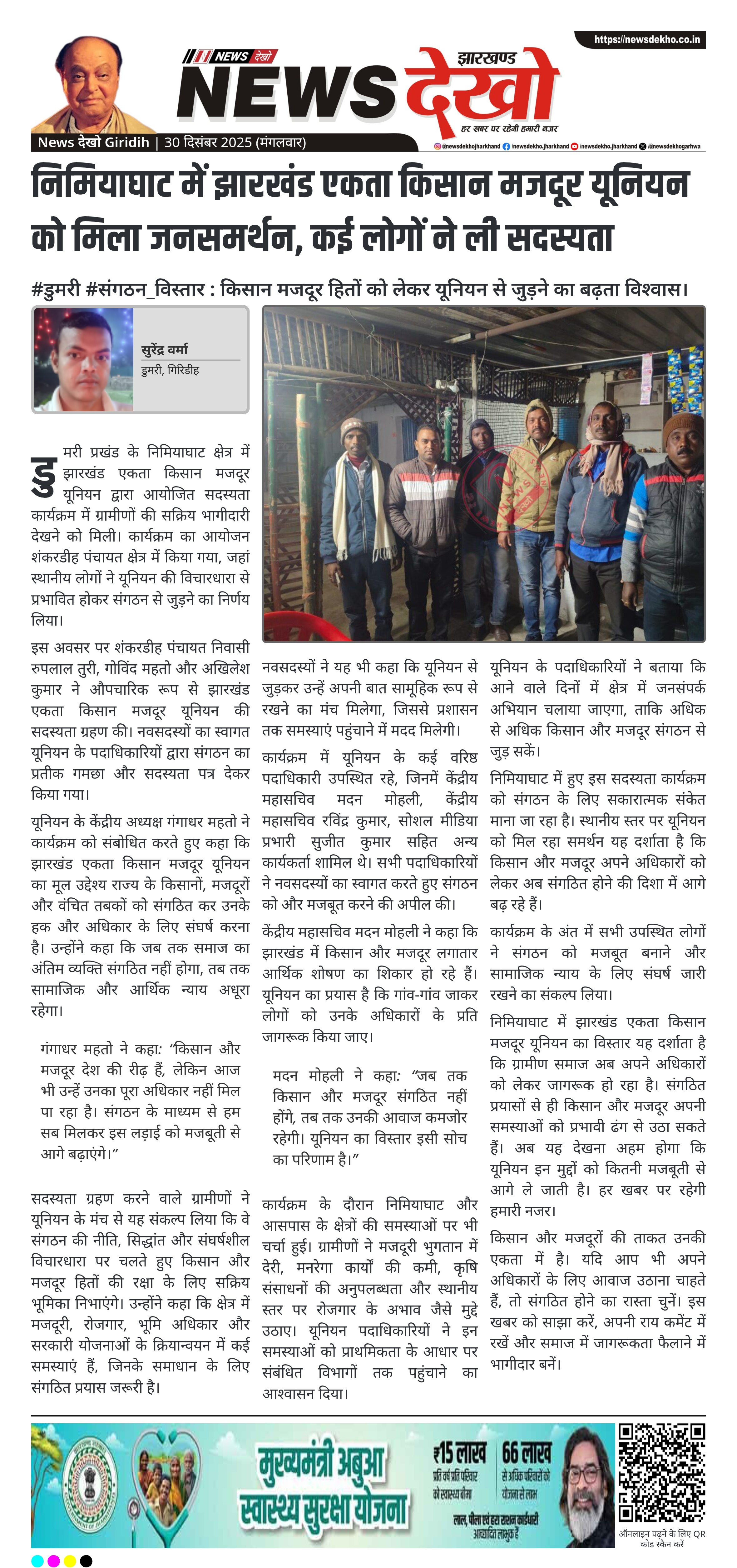 गिरिडीह जिले के डुमरी प्रखंड अंतर्गत निमियाघाट क्षेत्र में झारखंड एकता किसान मजदूर यूनियन के संगठनात्मक विस्तार को लेकर एक महत्वपूर्ण कार्यक्रम आयोजित किया गया। इस अवसर पर यूनियन के केंद्रीय अध्यक्ष गंगाधर महतो की उपस्थिति में कई स्थानीय ग्रामीणों ने औपचारिक रूप से यूनियन की सदस्यता ग्रहण की। कार्यक्रम का उद्देश्य किसान, मजदूर और वंचित वर्गों को संगठित कर उनके अधिकारों के लिए एकजुट आवाज बुलंद करना रहा। क्षेत्र में यूनियन को मिल रहा यह समर्थन संगठन की बढ़ती स्वीकार्यता को दर्शाता है।
