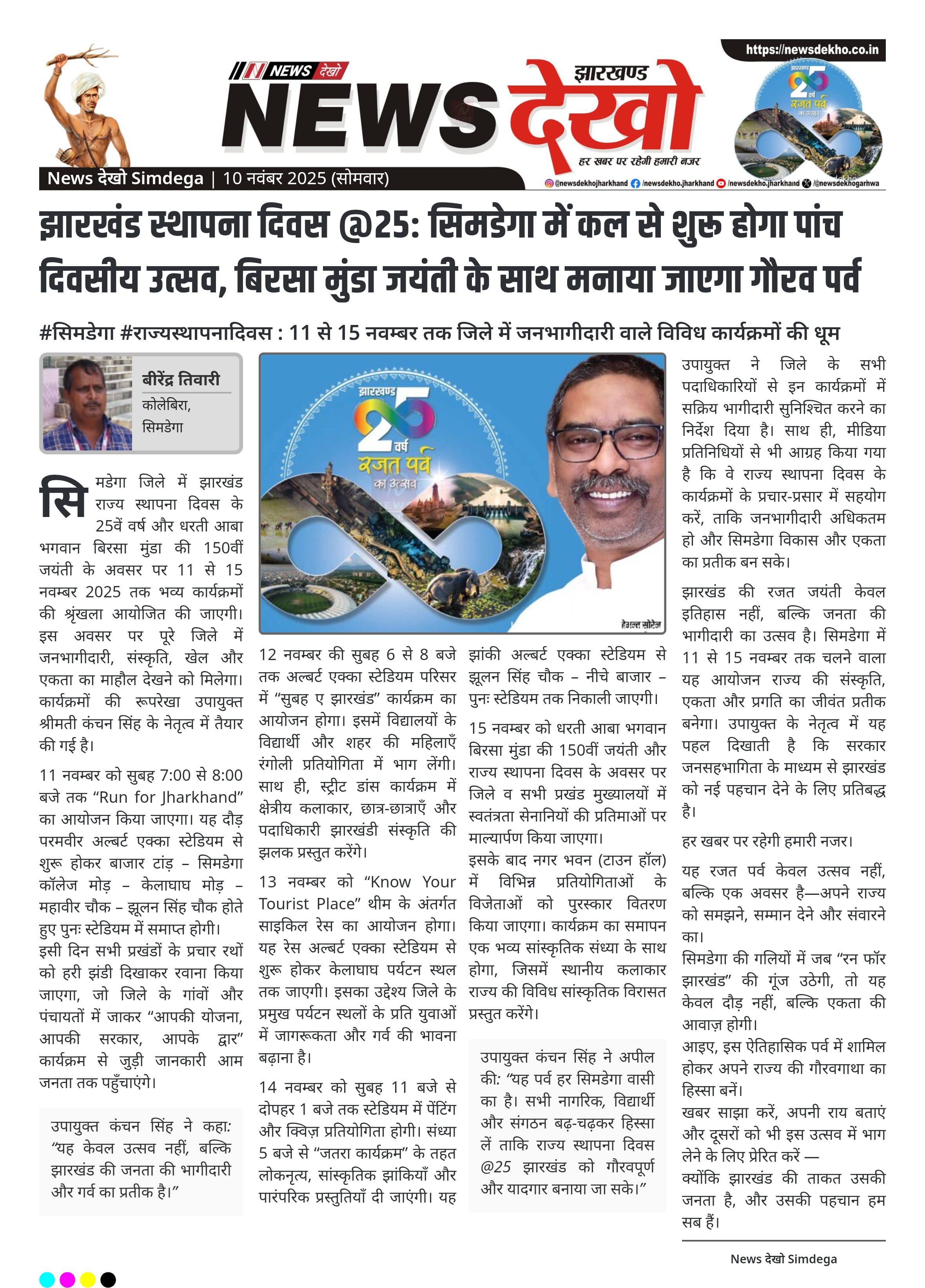सिमडेगा जिले में झारखंड राज्य स्थापना दिवस के 25वें वर्ष और धरती आबा भगवान बिरसा मुंडा की 150वीं जयंती के अवसर पर 11 से 15 नवम्बर 2025 तक भव्य कार्यक्रमों की श्रृंखला आयोजित की जाएगी। इस अवसर पर पूरे जिले में जनभागीदारी, संस्कृति, खेल और एकता का माहौल देखने को मिलेगा। कार्यक्रमों की रूपरेखा उपायुक्त श्रीमती कंचन सिंह के नेतृत्व में तैयार की गई है।
