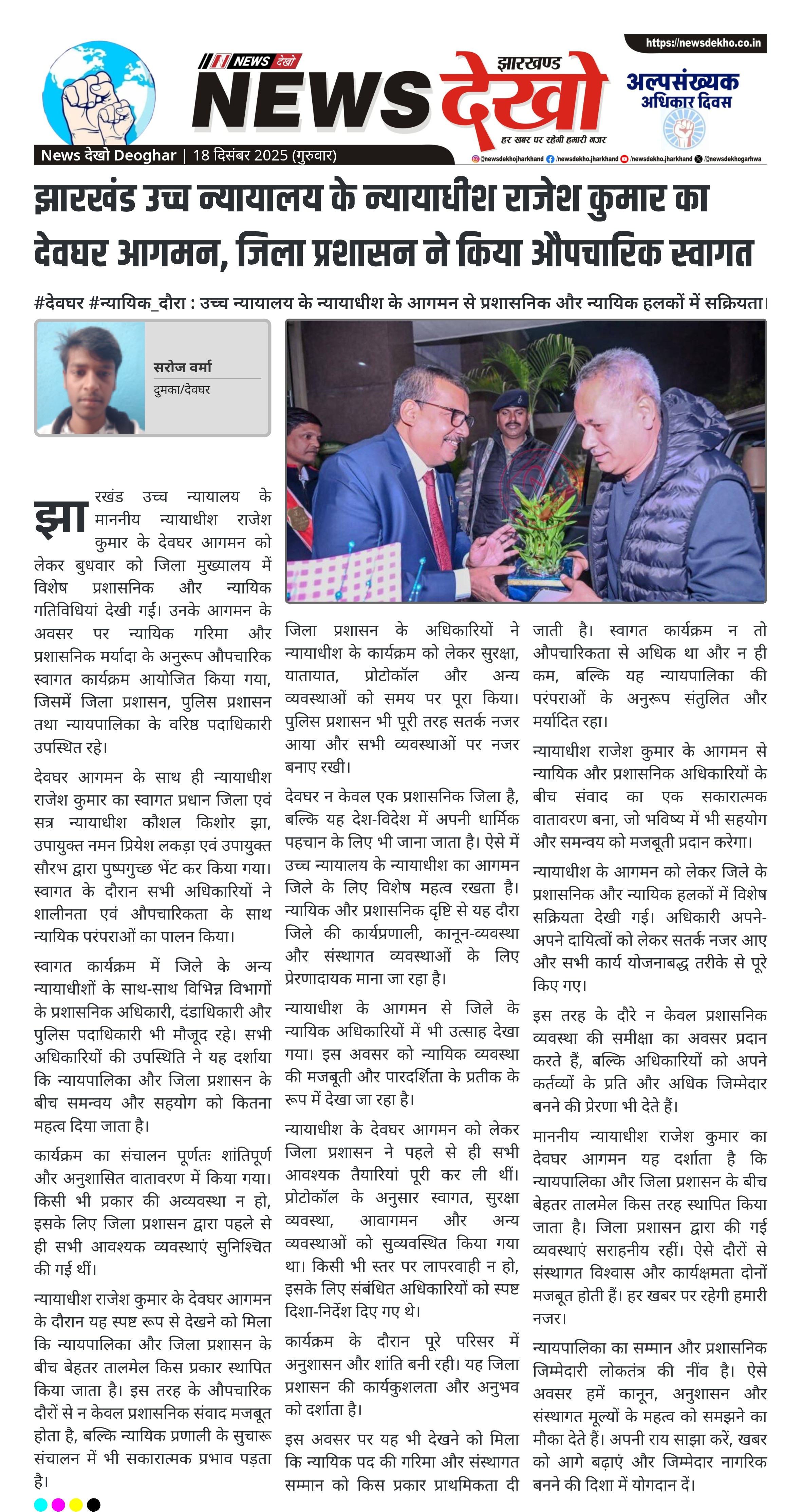 झारखंड उच्च न्यायालय के माननीय न्यायाधीश राजेश कुमार का 17 दिसंबर 2025 को देवघर आगमन हुआ। उनके आगमन पर जिला प्रशासन और न्यायपालिका के वरिष्ठ अधिकारियों ने औपचारिक स्वागत किया। यह दौरा न्यायिक मर्यादा, प्रशासनिक समन्वय और संस्थागत संवाद के दृष्टिकोण से महत्वपूर्ण माना जा रहा है। न्यायाधीश के आगमन को लेकर जिले में प्रशासनिक स्तर पर सभी आवश्यक तैयारियां की गई थीं।