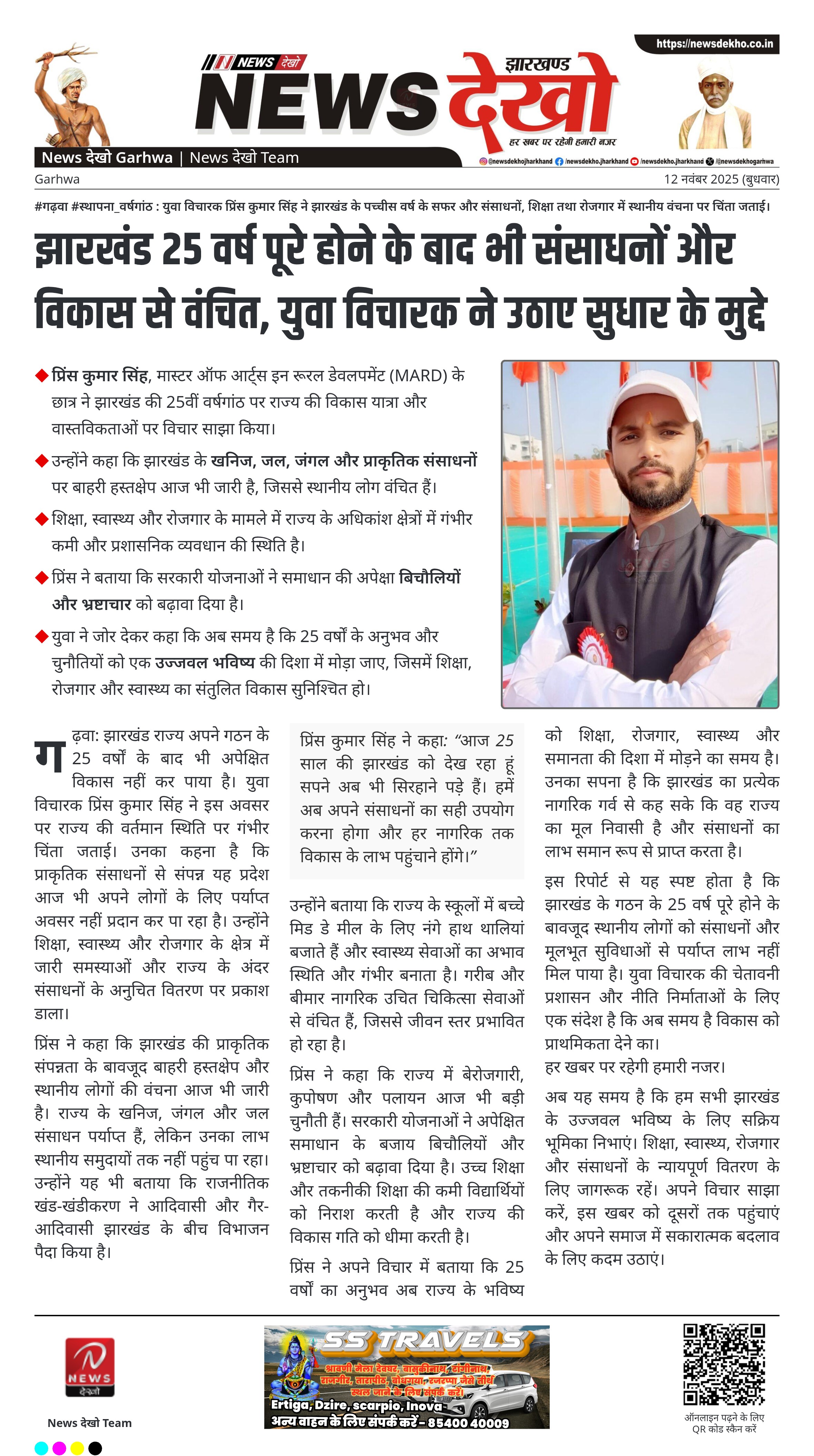 #गढ़वा #स्थापना_वर्षगांठ : युवा विचारक प्रिंस कुमार सिंह ने झारखंड के पच्चीस वर्ष के सफर और संसाधनों, शिक्षा तथा रोजगार में स्थानीय वंचना पर चिंता जताई।
