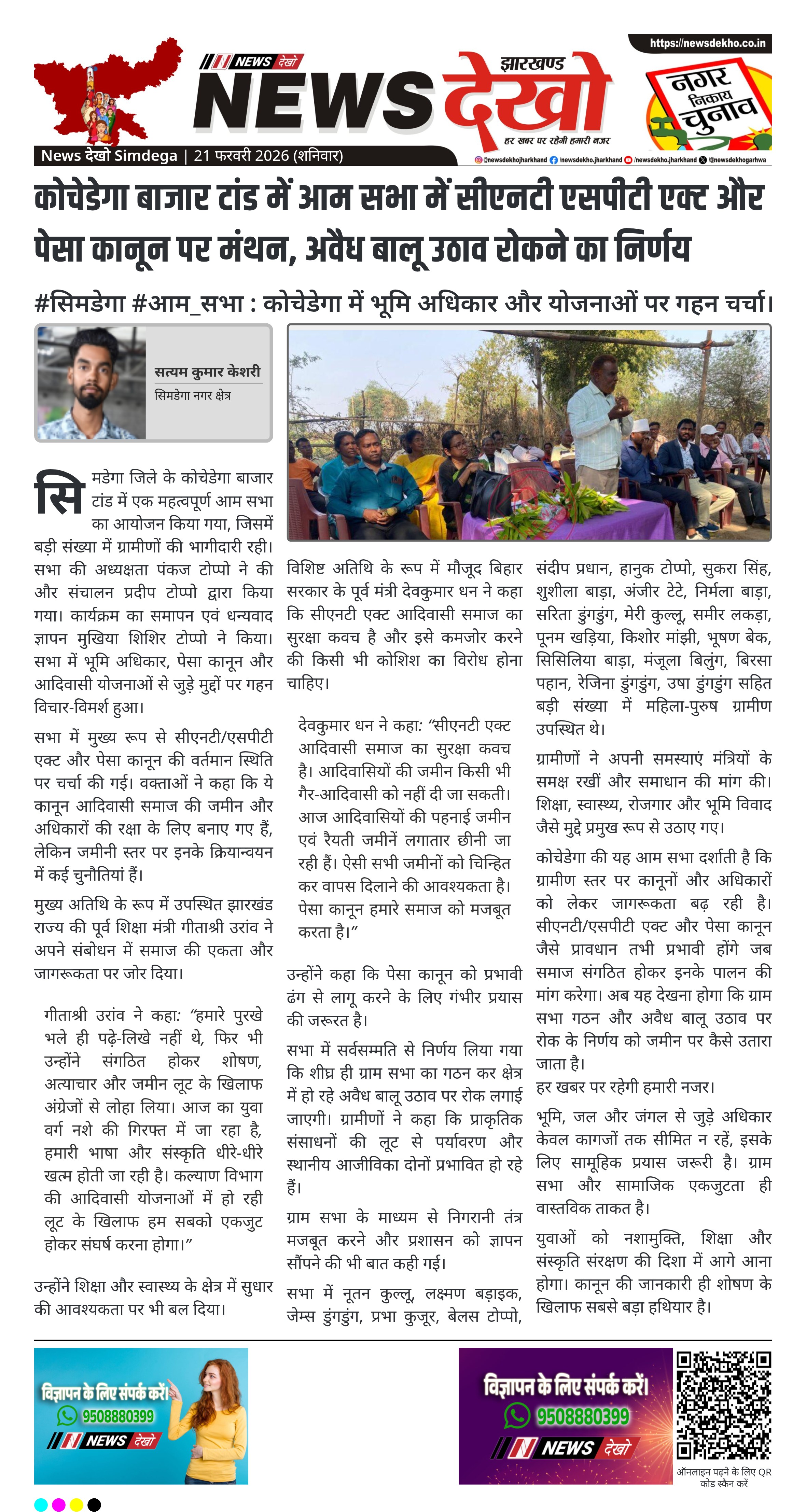 #सिमडेगा #आम_सभा : कोचेडेगा में भूमि अधिकार और योजनाओं पर गहन चर्चा। कोचेडेगा बाजार टांड, सिमडेगा में आयोजित हुई आम सभा। पंकज टोप्पो की अध्यक्षता, प्रदीप टोप्पो ने किया संचालन। मुख्य अतिथि गीताश्री उरांव, विशिष्ट अतिथि देवकुमार धन रहे उपस्थित। सीएनटी/एसपीटी एक्ट, पेसा कानून और योजनाओं में अनियमितता पर चर्चा।…