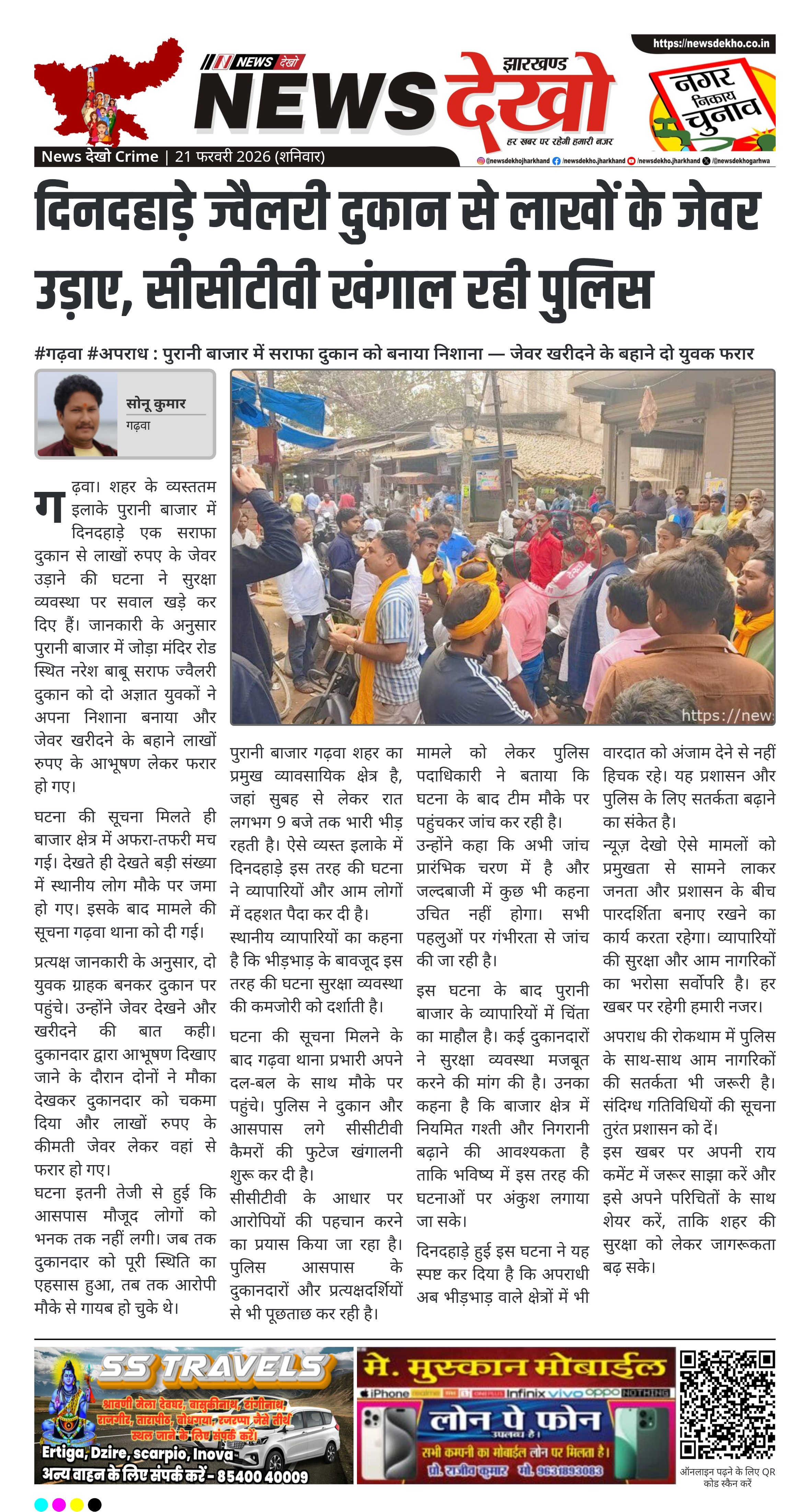 #गढ़वा #अपराध : पुरानी बाजार में सराफा दुकान को बनाया निशाना — जेवर खरीदने के बहाने दो युवक फरार पुरानी बाजार स्थित नरेश बाबू सराफ ज्वैलरी दुकान से दिनदहाड़े वारदात दो युवक जेवर खरीदने के बहाने पहुंचे, दुकानदार को दिया चकमा लाखों रुपए के कीमती आभूषण लेकर फरार सूचना पर…