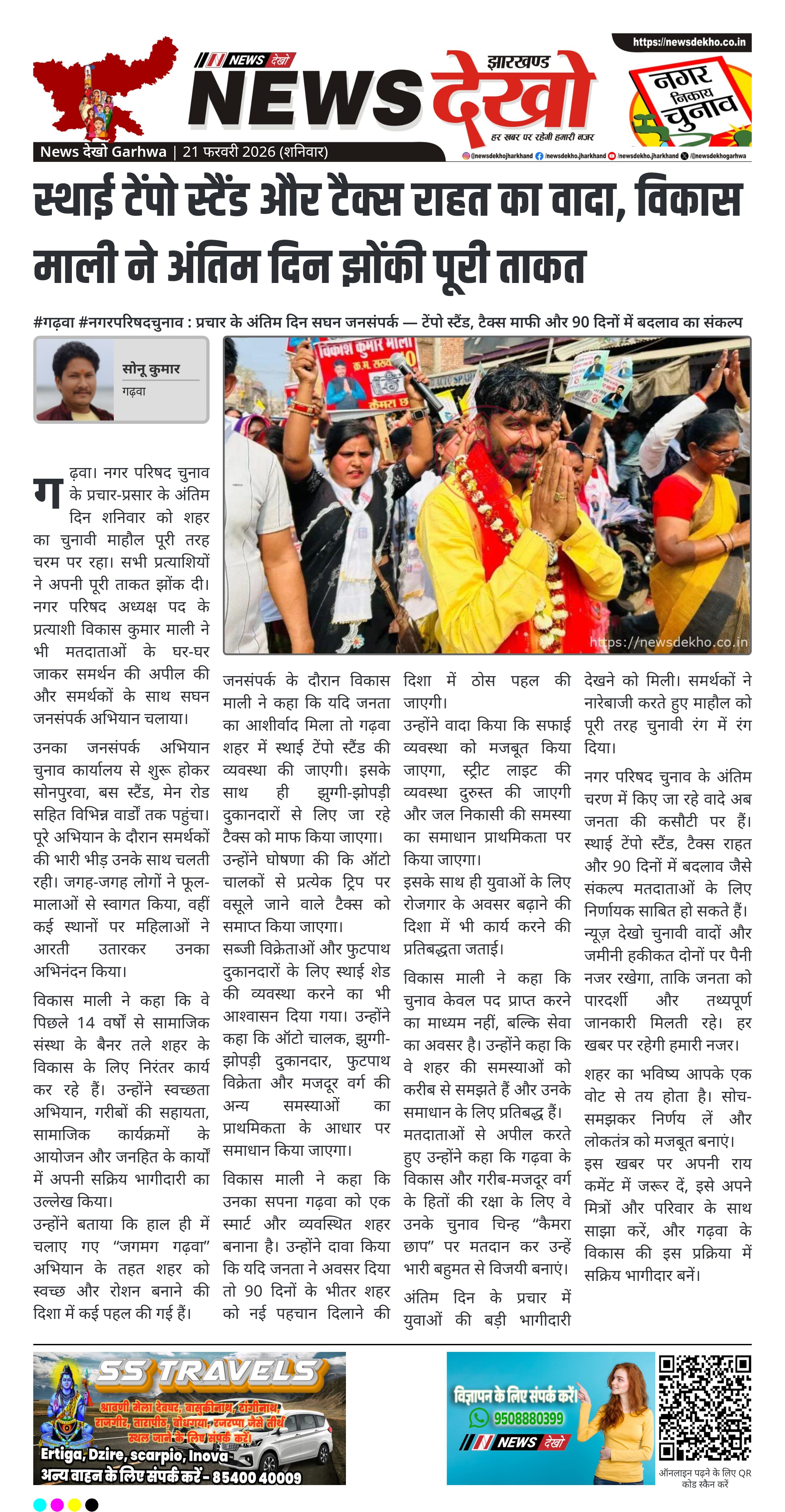 #गढ़वा #नगरपरिषदचुनाव : प्रचार के अंतिम दिन सघन जनसंपर्क — टेंपो स्टैंड, टैक्स माफी और 90 दिनों में बदलाव का संकल्प प्रचार के अंतिम दिन विकास कुमार माली का सघन जनसंपर्क अभियान शहर में स्थाई टेंपो स्टैंड बनाने और झुग्गी-झोपड़ी दुकानदारों से टैक्स माफी का वादा ऑटो चालकों से प्रति…
