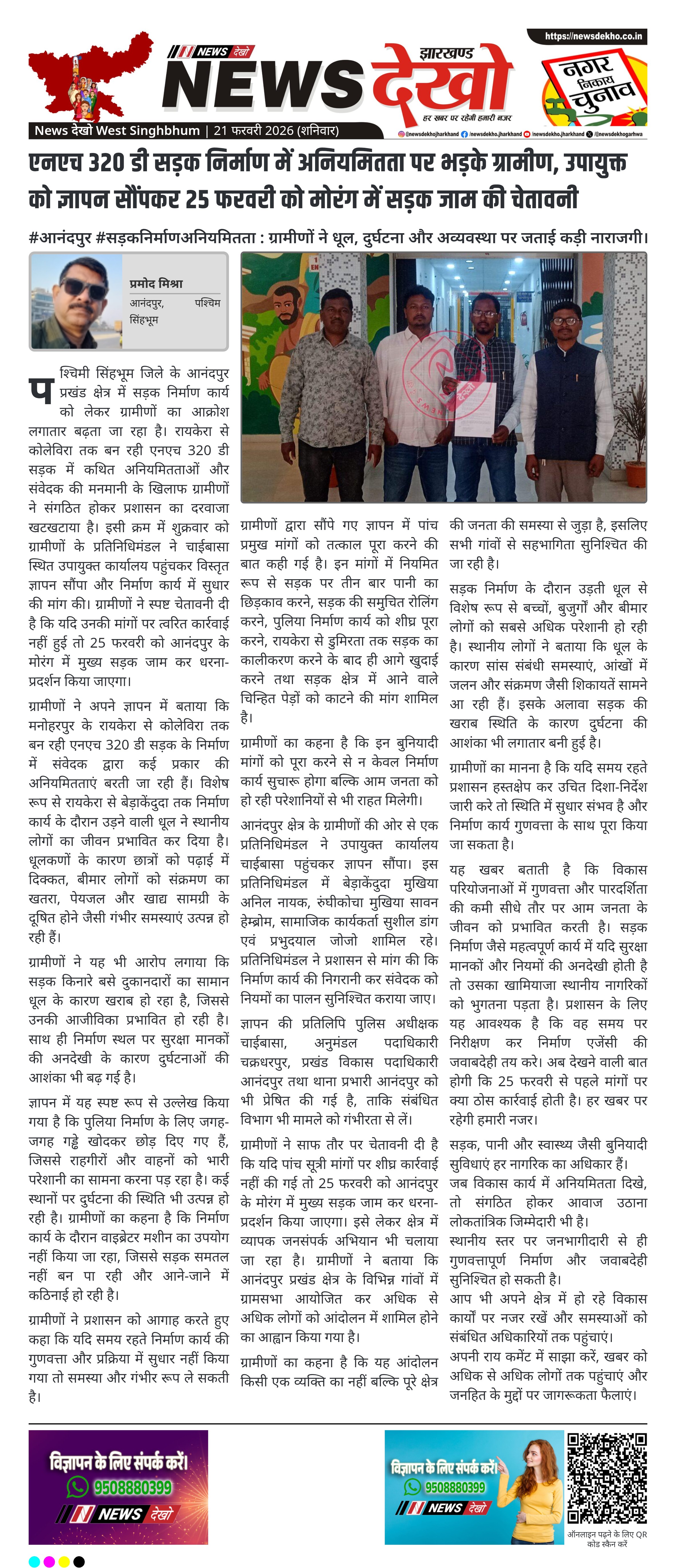 #आनंदपुर #सड़कनिर्माणअनियमितता : ग्रामीणों ने धूल, दुर्घटना और अव्यवस्था पर जताई कड़ी नाराजगी। आनंदपुर ग्रामीणों ने उपायुक्त चाईबासा को सौंपा ज्ञापन। एनएच 320 डी सड़क निर्माण में संवेदक पर अनियमितता का आरोप। धूल, दुर्घटना और अधूरे कार्य से छात्रों, मरीजों व दुकानदारों को परेशानी। 25 फरवरी को मोरंग मुख्य सड़क…