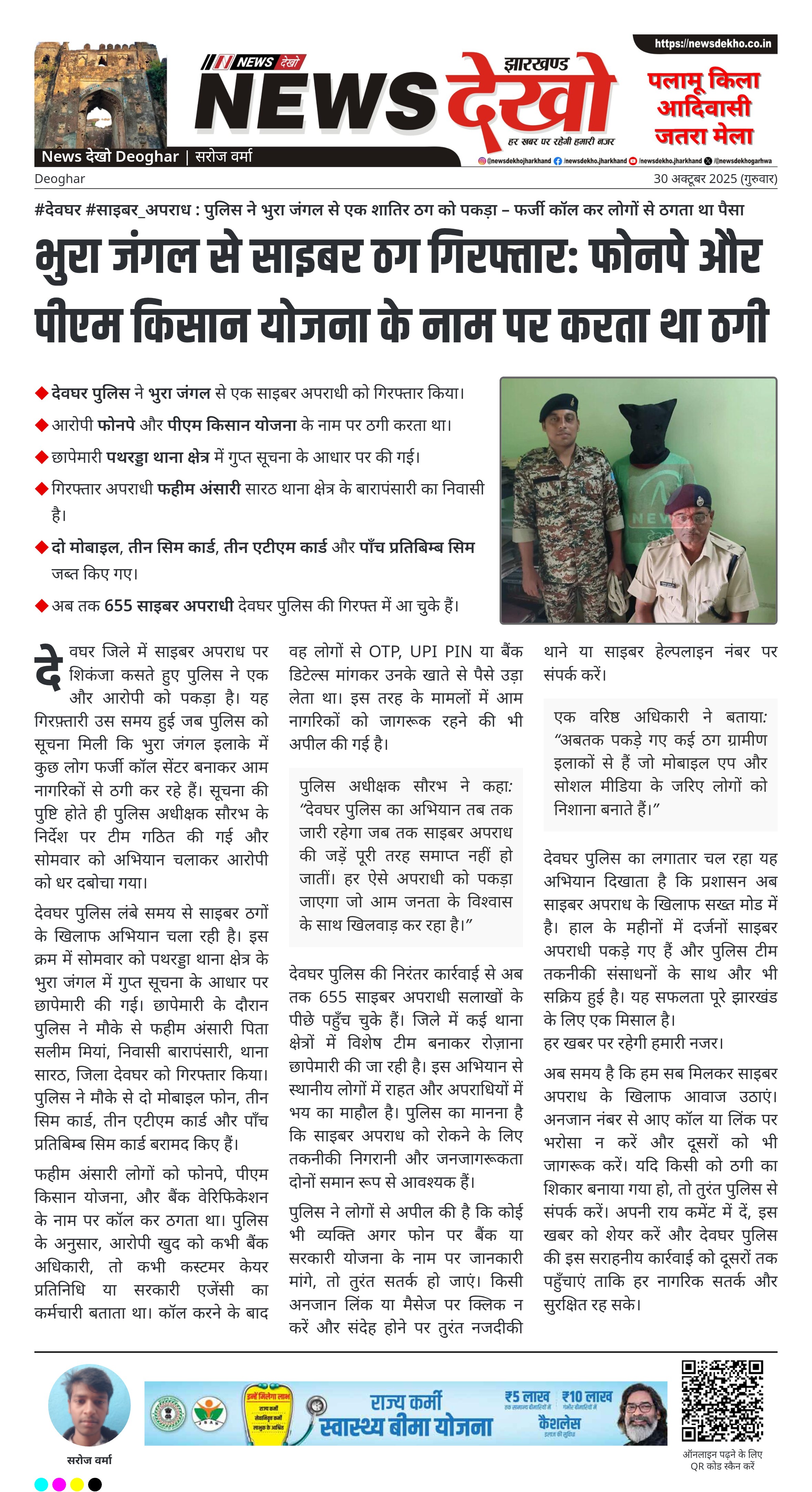 #देवघर #साइबर_अपराध : पुलिस ने भुरा जंगल से एक शातिर ठग को पकड़ा – फर्जी कॉल कर लोगों से ठगता था पैसा देवघर पुलिस ने भुरा जंगल से एक साइबर अपराधी को गिरफ्तार किया। आरोपी फोनपे और पीएम किसान योजना के नाम पर ठगी करता था। छापेमारी पथरड्डा थाना क्षेत्र…