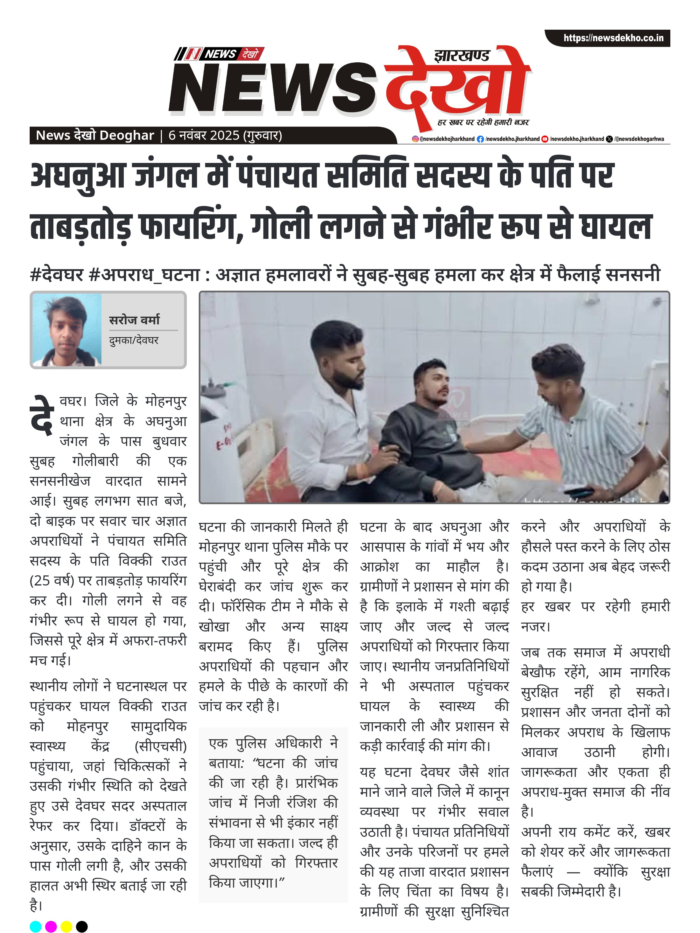 #देवघर #अपराध_घटना : अज्ञात हमलावरों ने सुबह-सुबह हमला कर क्षेत्र में फैलाई सनसनी अघनुआ जंगल के पास बुधवार सुबह हुई फायरिंग की घटना से इलाके में दहशत। पंचायत समिति सदस्य के पति विक्की राउत पर चार अपराधियों ने की अंधाधुंध गोलीबारी। 25 वर्षीय विक्की राउत के दाहिने कान में गोली…
