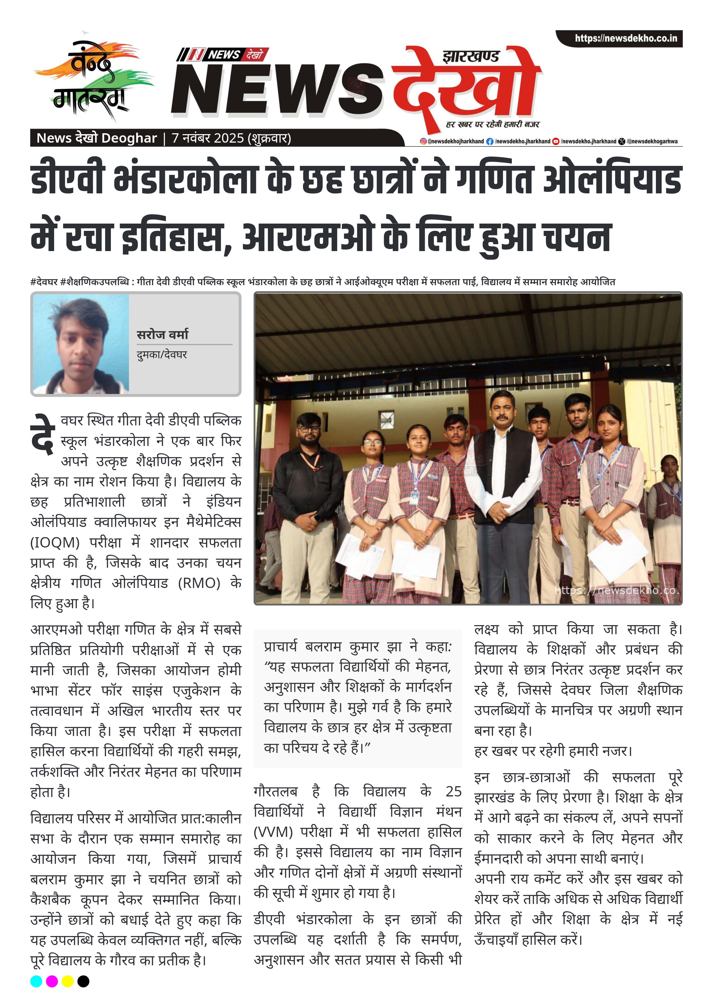 #देवघर #शैक्षणिकउपलब्धि : गीता देवी डीएवी पब्लिक स्कूल भंडारकोला के छह छात्रों ने आईओक्यूएम परीक्षा में सफलता पाई, विद्यालय में सम्मान समारोह आयोजित गीता देवी डीएवी पब्लिक स्कूल भंडारकोला के छह छात्रों का चयन क्षेत्रीय गणित ओलंपियाड (RMO) के लिए हुआ। चयनित छात्र हैं – अमित कुमार, मानवी सिंह, सत्यम…