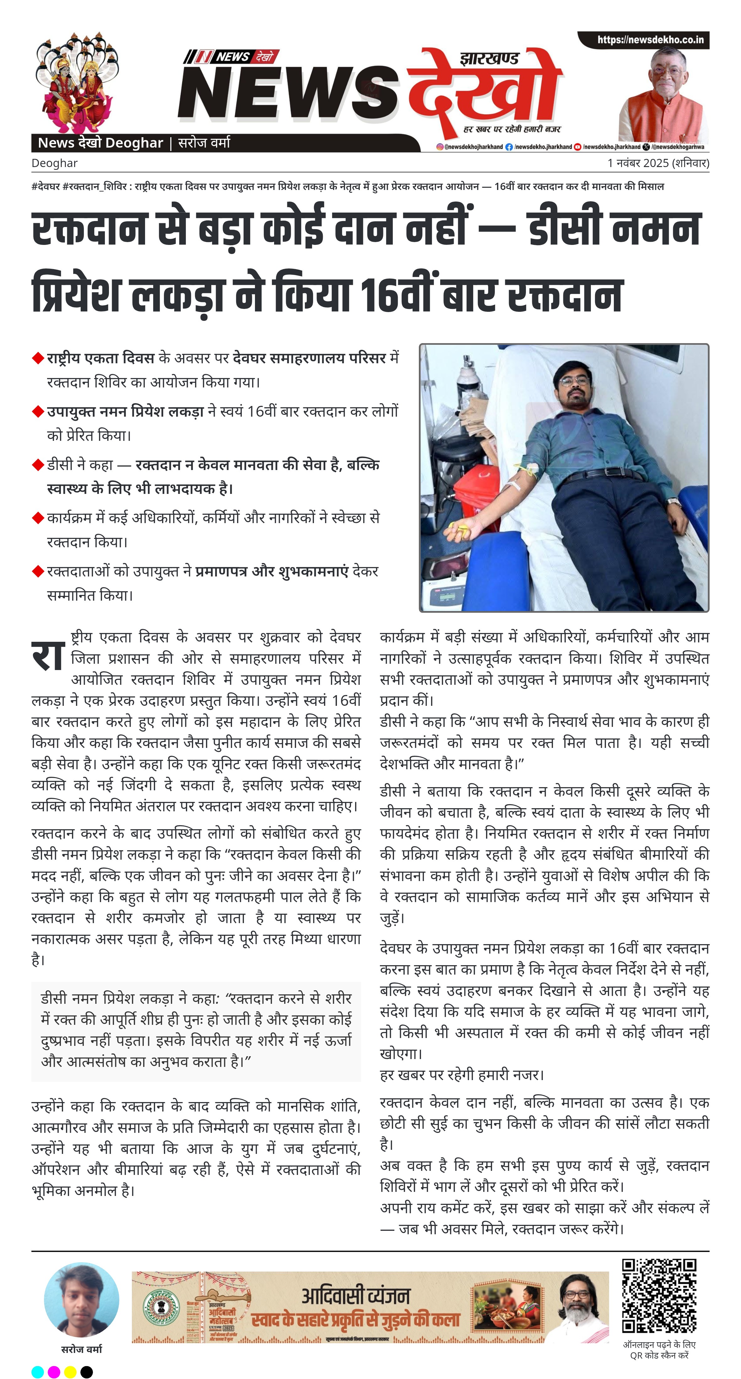 #देवघर #रक्तदान_शिविर : राष्ट्रीय एकता दिवस पर उपायुक्त नमन प्रियेश लकड़ा के नेतृत्व में हुआ प्रेरक रक्तदान आयोजन — 16वीं बार रक्तदान कर दी मानवता की मिसाल राष्ट्रीय एकता दिवस के अवसर पर देवघर समाहरणालय परिसर में रक्तदान शिविर का आयोजन किया गया। उपायुक्त नमन प्रियेश लकड़ा ने स्वयं 16वीं…