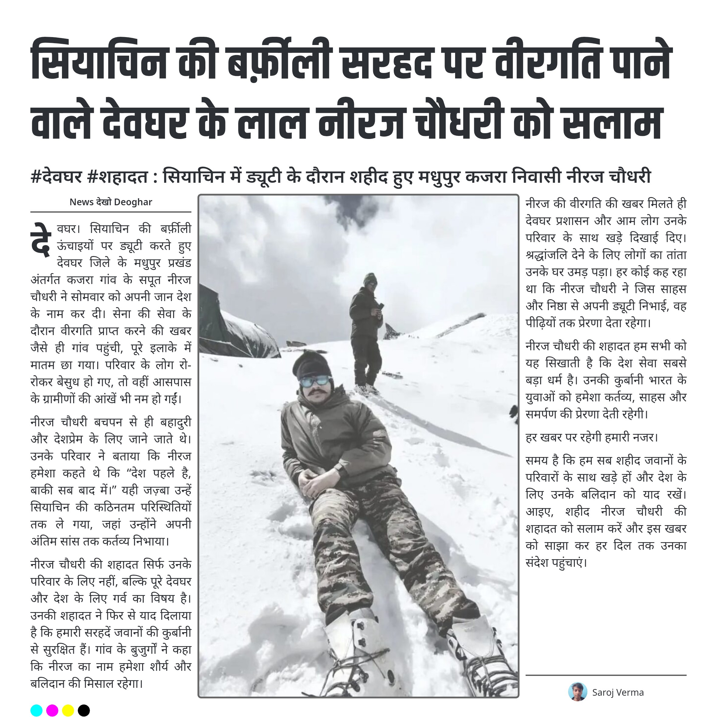 सियाचिन की बर्फ़ीली सरहद पर वीरगति पाने वाले देवघर के लाल नीरज चौधरी को सलाम