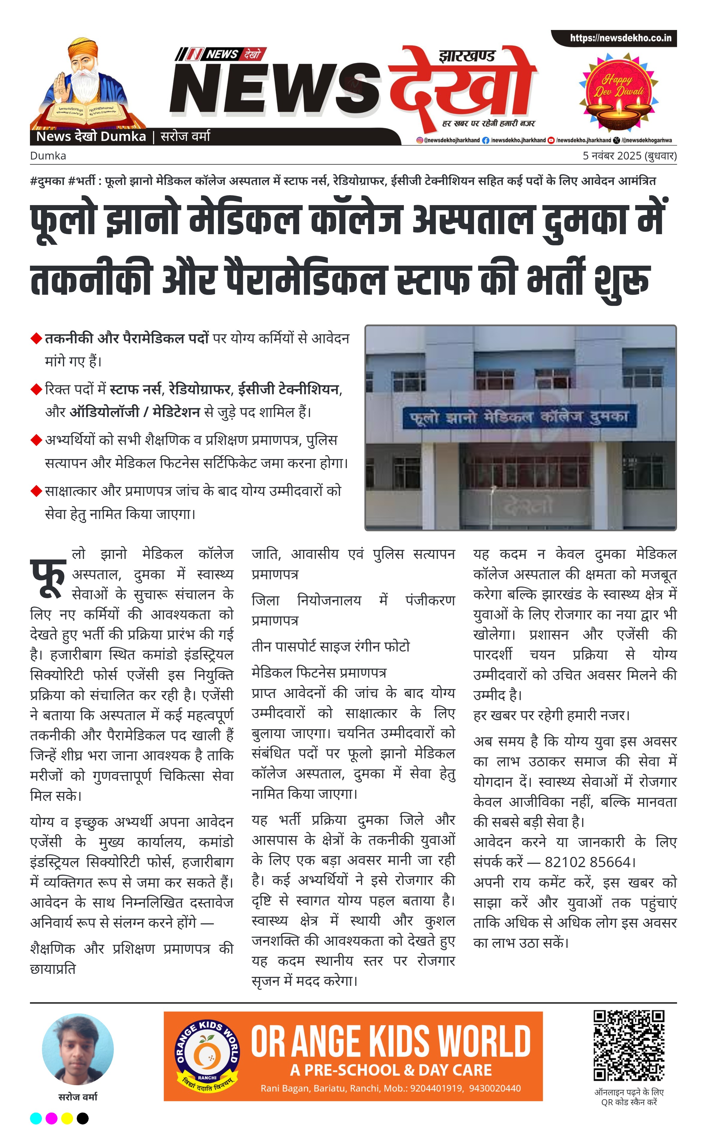 फूलो झानो मेडिकल कॉलेज अस्पताल दुमका में तकनीकी और पैरामेडिकल स्टाफ की भर्ती शुरू