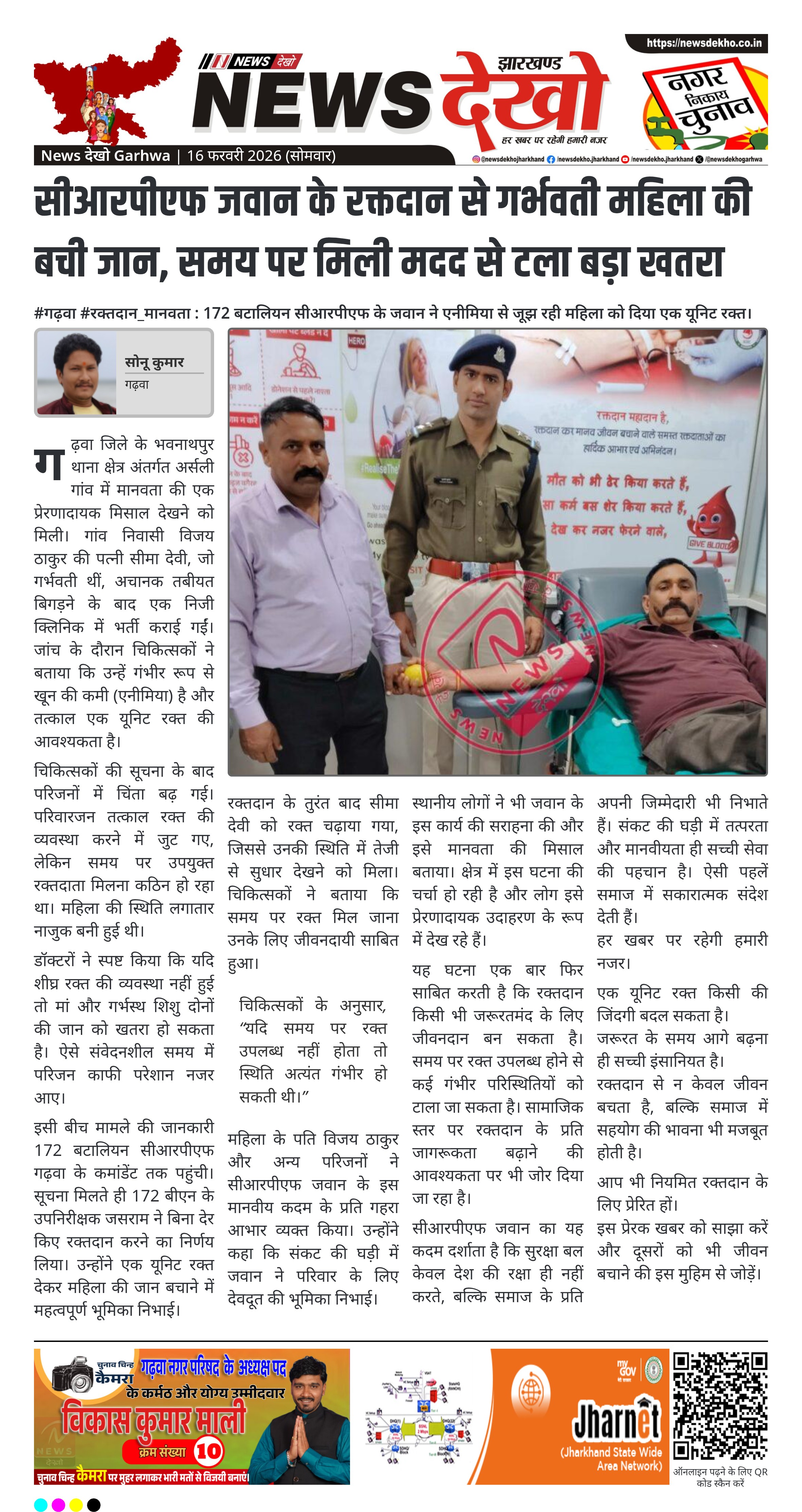 #गढ़वा #रक्तदान_मानवता : 172 बटालियन सीआरपीएफ के जवान ने एनीमिया से जूझ रही महिला को दिया एक यूनिट रक्त। भवनाथपुर थाना क्षेत्र के अर्सली गांव की घटना। गर्भवती सीमा देवी को गंभीर एनीमिया, तत्काल रक्त की जरूरत। 172 बटालियन सीआरपीएफ गढ़वा के उपनिरीक्षक जसराम ने किया रक्तदान। एक यूनिट रक्त…