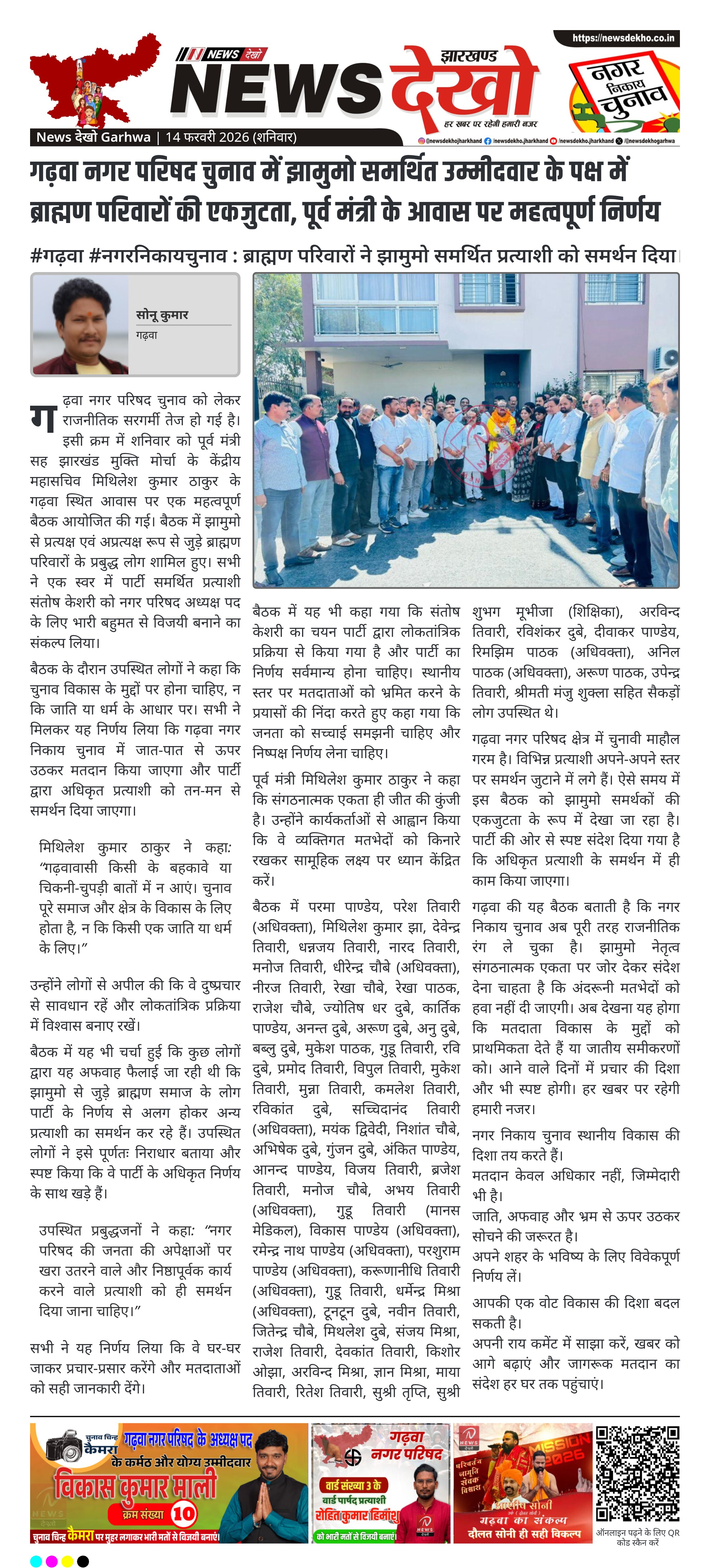 गढ़वा नगर परिषद चुनाव में झामुमो समर्थित उम्मीदवार के पक्ष में ब्राह्मण परिवारों की एकजुटता, पूर्व मंत्री के आवास पर महत्वपूर्ण निर्णय