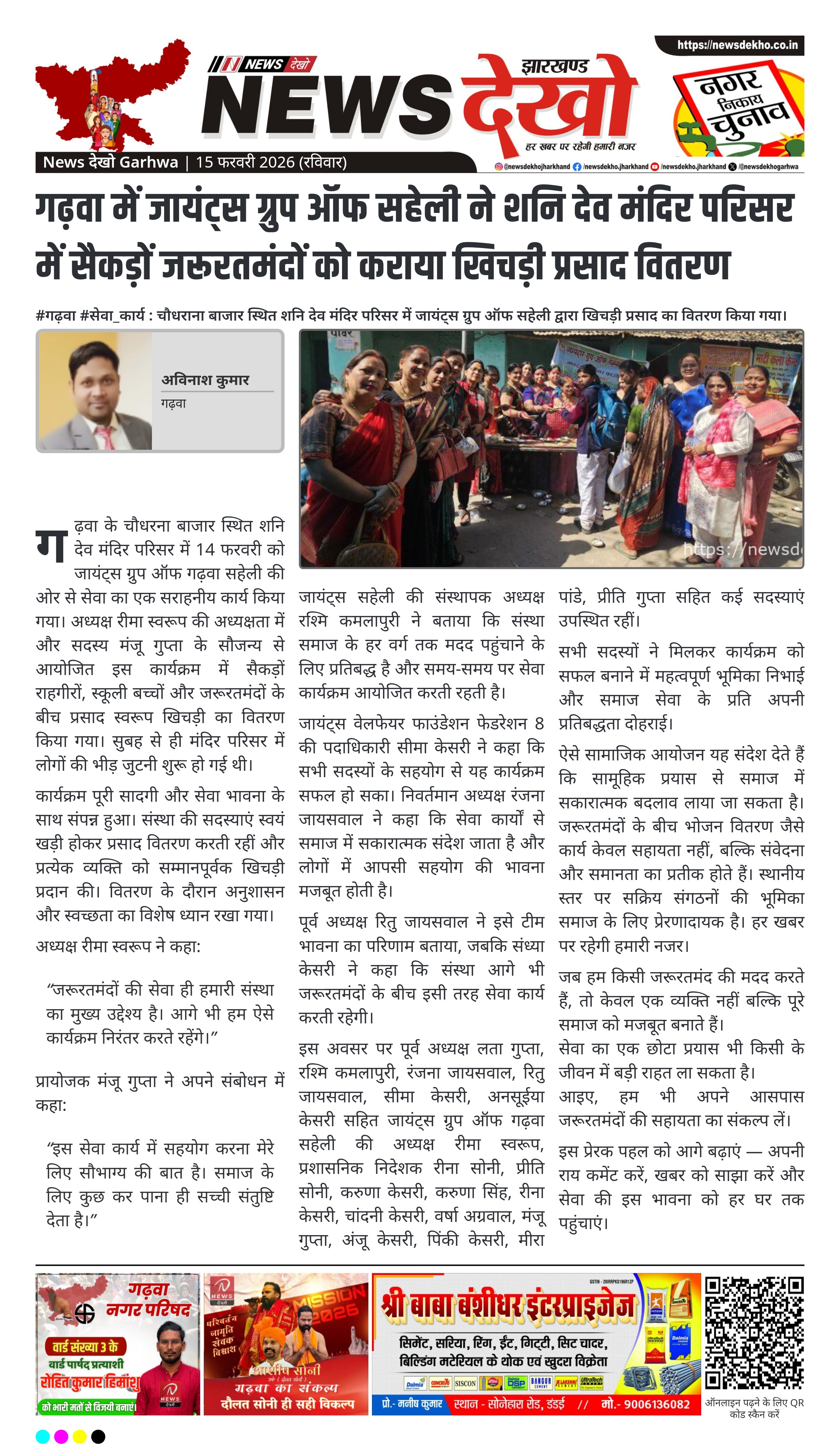 #गढ़वा #सेवा_कार्य : चौधराना बाजार स्थित शनि देव मंदिर परिसर में जायंट्स ग्रुप ऑफ सहेली द्वारा खिचड़ी प्रसाद का वितरण किया गया। जायंट्स ग्रुप ऑफ गढ़वा सहेली द्वारा 14 फरवरी को सेवा कार्यक्रम आयोजित। शनि देव मंदिर, चौधरना बाजार में सैकड़ों लोगों के बीच खिचड़ी प्रसाद वितरण। अध्यक्ष रीमा स्वरूप…