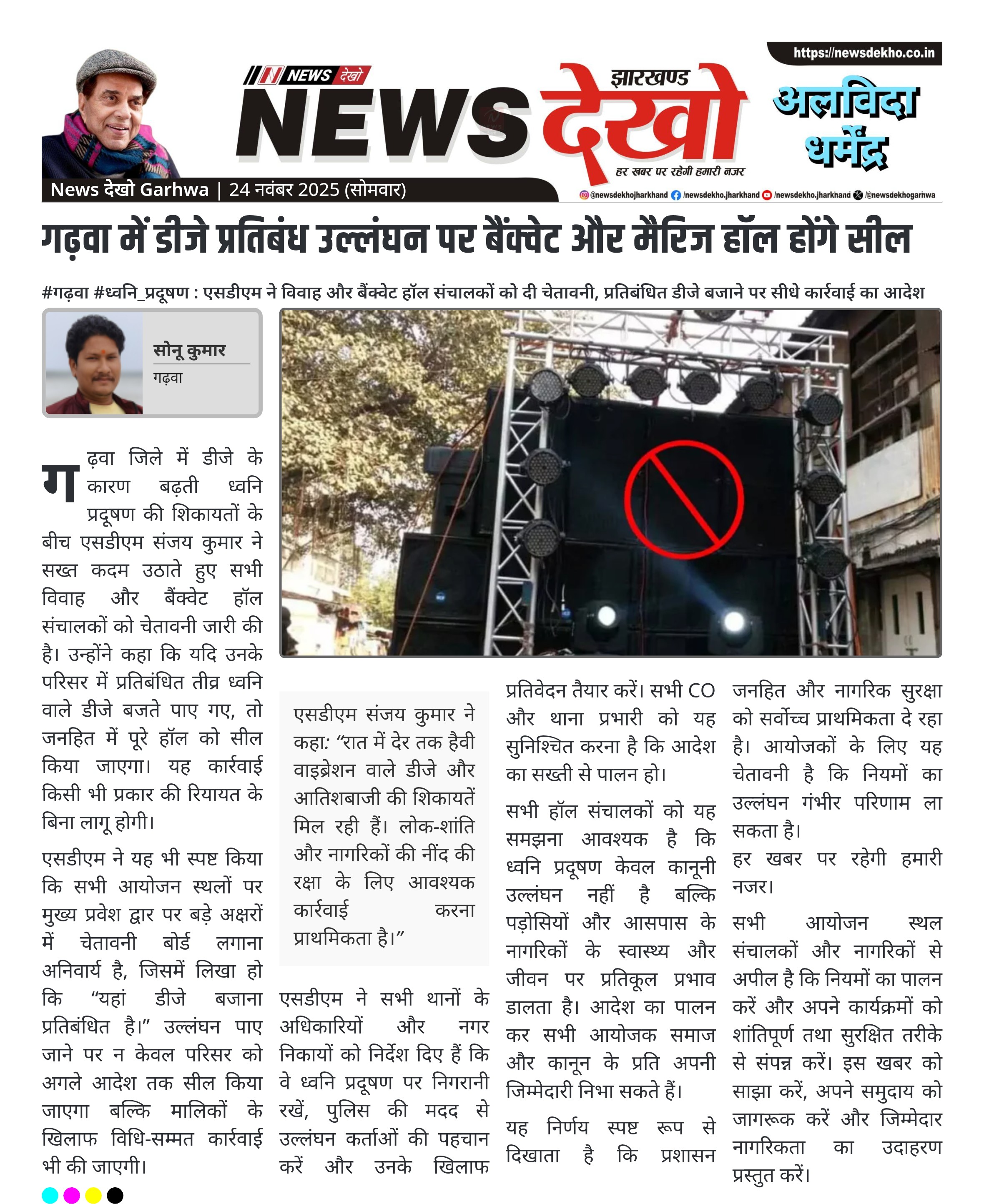 #गढ़वा #ध्वनि_प्रदूषण : एसडीएम ने विवाह और बैंक्वेट हॉल संचालकों को दी चेतावनी, प्रतिबंधित डीजे बजाने पर सीधे कार्रवाई का आदेश एसडीएम संजय कुमार ने डीजे प्रतिबंध का उल्लंघन करने वालों के लिए सख्त चेतावनी दी। उल्लंघन पाए जाने पर पूरे बैंक्वेट हॉल/बारात घर को सील किया जाएगा। सभी विवाह…