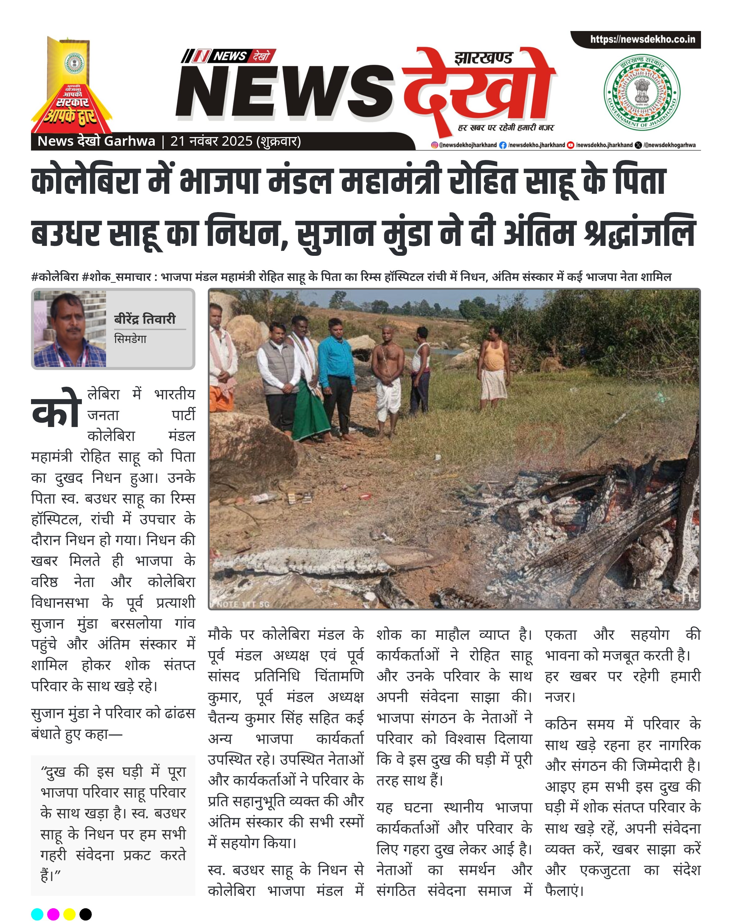 कोलेबिरा में भाजपा मंडल महामंत्री रोहित साहू के पिता बउधर साहू का निधन, सुजान मुंडा ने दी अंतिम श्रद्धांजलि