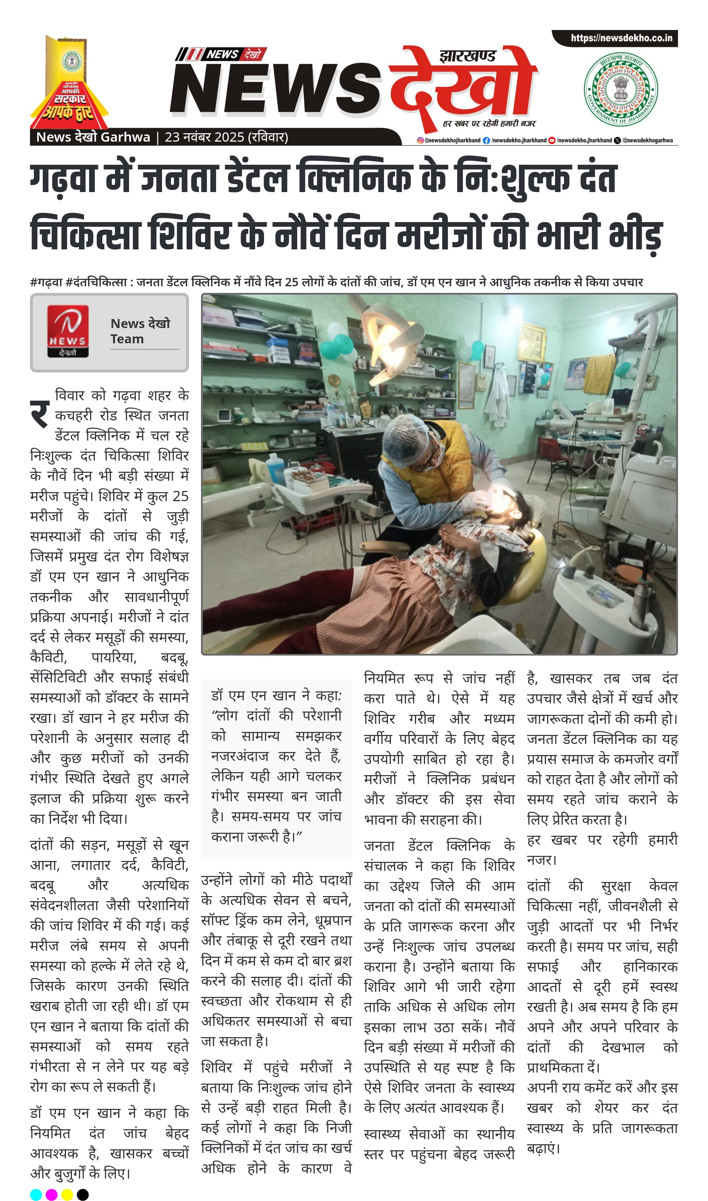 गढ़वा में जनता डेंटल क्लिनिक के निःशुल्क दंत चिकित्सा शिविर के नौवें दिन मरीजों की भारी भीड़