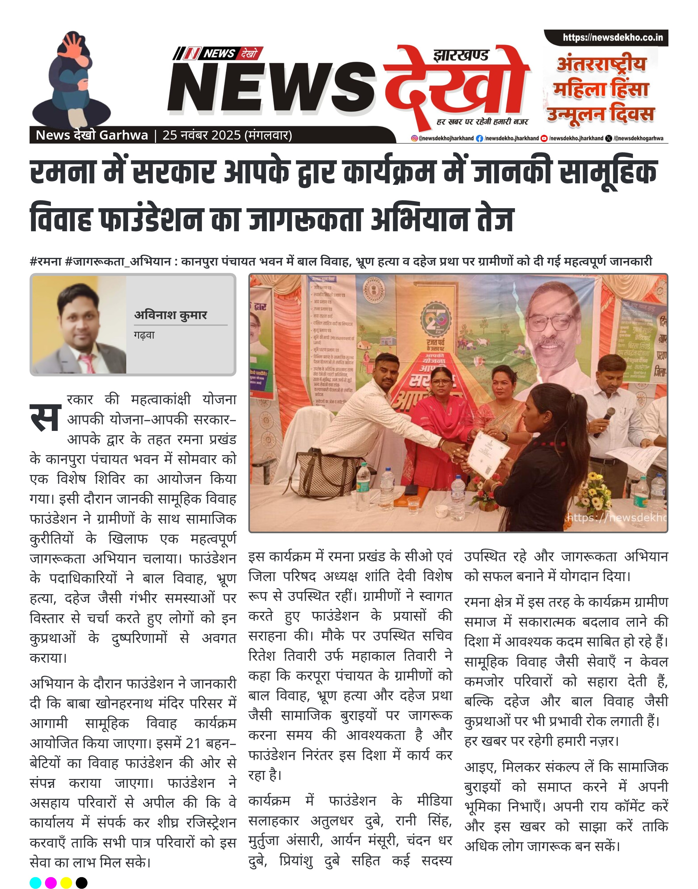 रमना में सरकार आपके द्वार कार्यक्रम में जानकी सामूहिक विवाह फाउंडेशन का जागरूकता अभियान तेज