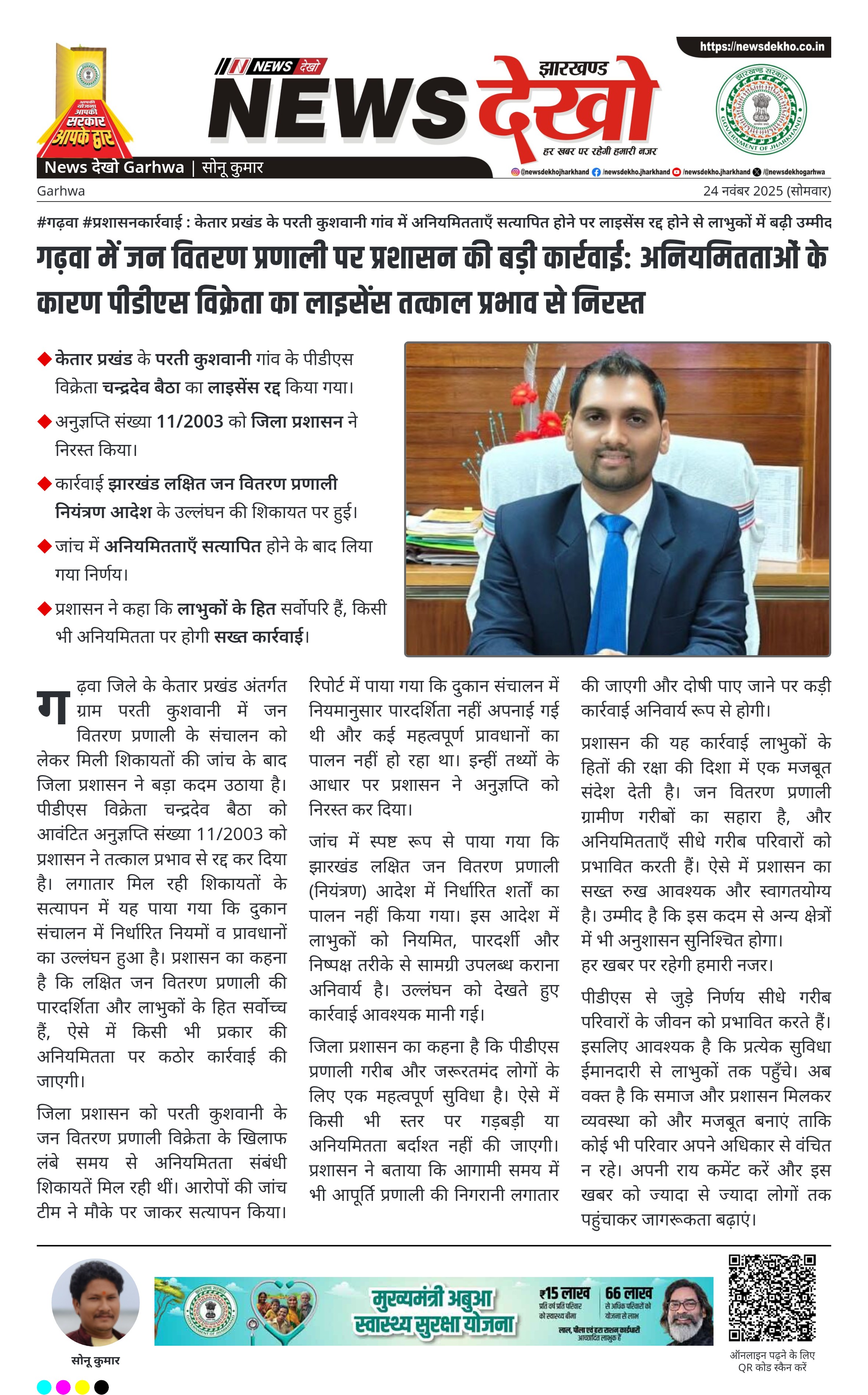 गढ़वा में जन वितरण प्रणाली पर प्रशासन की बड़ी कार्रवाई: अनियमितताओं के कारण पीडीएस विक्रेता का लाइसेंस तत्काल प्रभाव से निरस्त