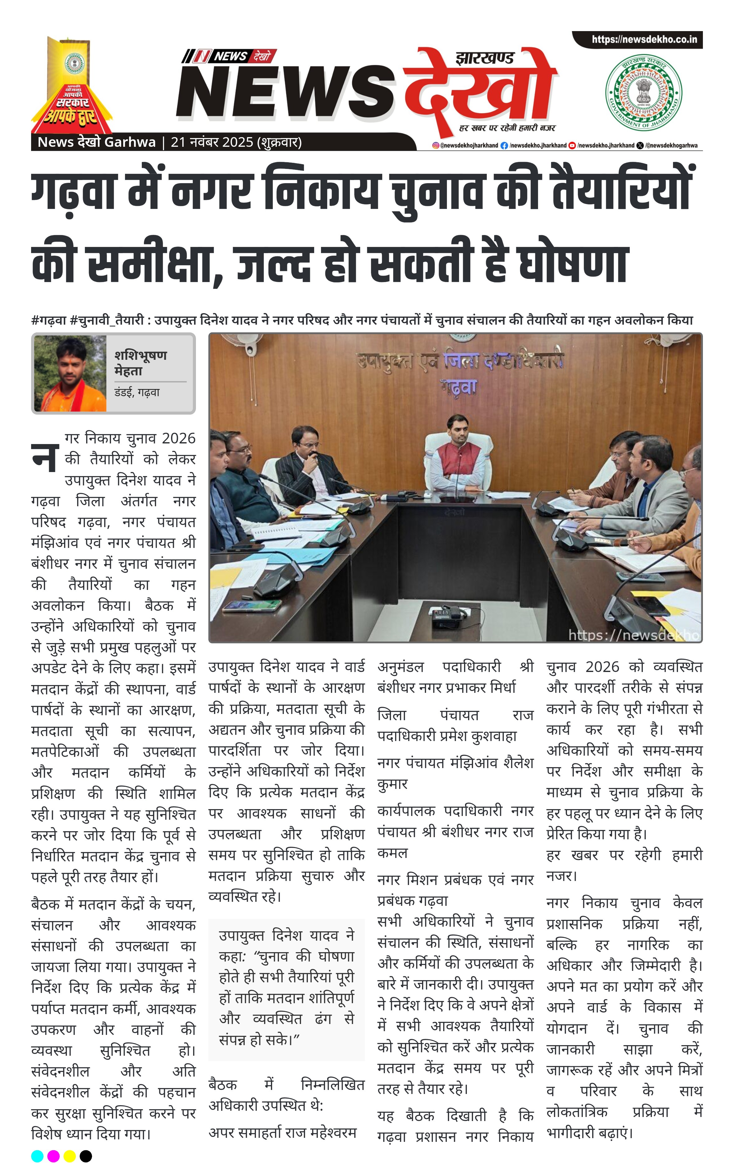 #गढ़वा #चुनावी_तैयारी : उपायुक्त दिनेश यादव ने नगर परिषद और नगर पंचायतों में चुनाव संचालन की तैयारियों का गहन अवलोकन किया उपायुक्त दिनेश यादव ने चुनाव तैयारियों की समीक्षा की। नगर परिषद गढ़वा, नगर पंचायत मंझिआंव और नगर पंचायत श्री बंशीधर नगर शामिल। मतदान केंद्र, मतदाता सूची और वार्ड आरक्षण…