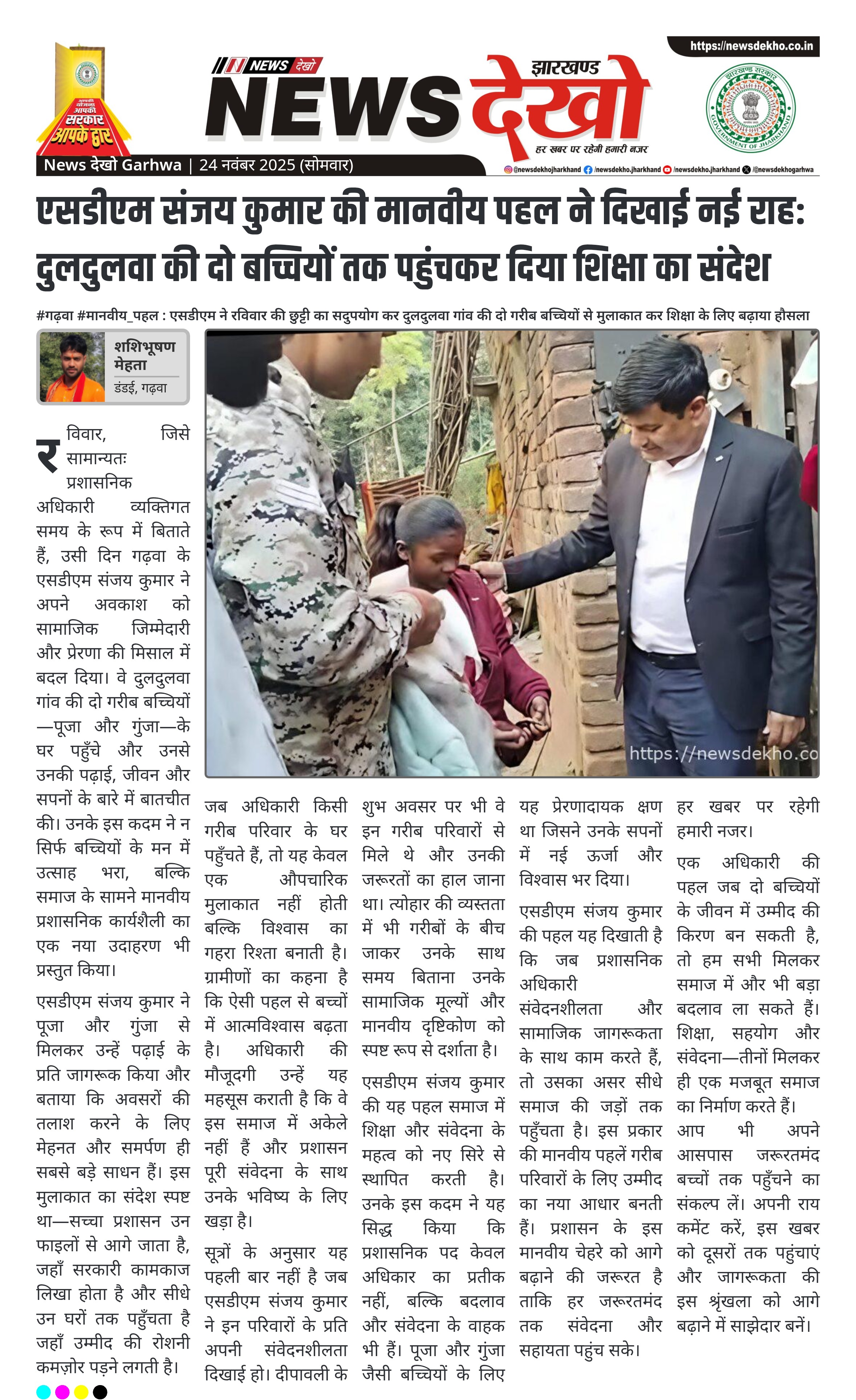 #गढ़वा #मानवीय_पहल : एसडीएम ने रविवार की छुट्टी का सदुपयोग कर दुलदुलवा गांव की दो गरीब बच्चियों से मुलाकात कर शिक्षा के लिए बढ़ाया हौसला मेराल प्रखंड के एसडीएम संजय कुमार रविवार की छुट्टी में दुलदुलवा गांव पहुँचे। गरीब बच्चियों पूजा और गुंजा से घर जाकर हालचाल लिया प्रेरित किया।…