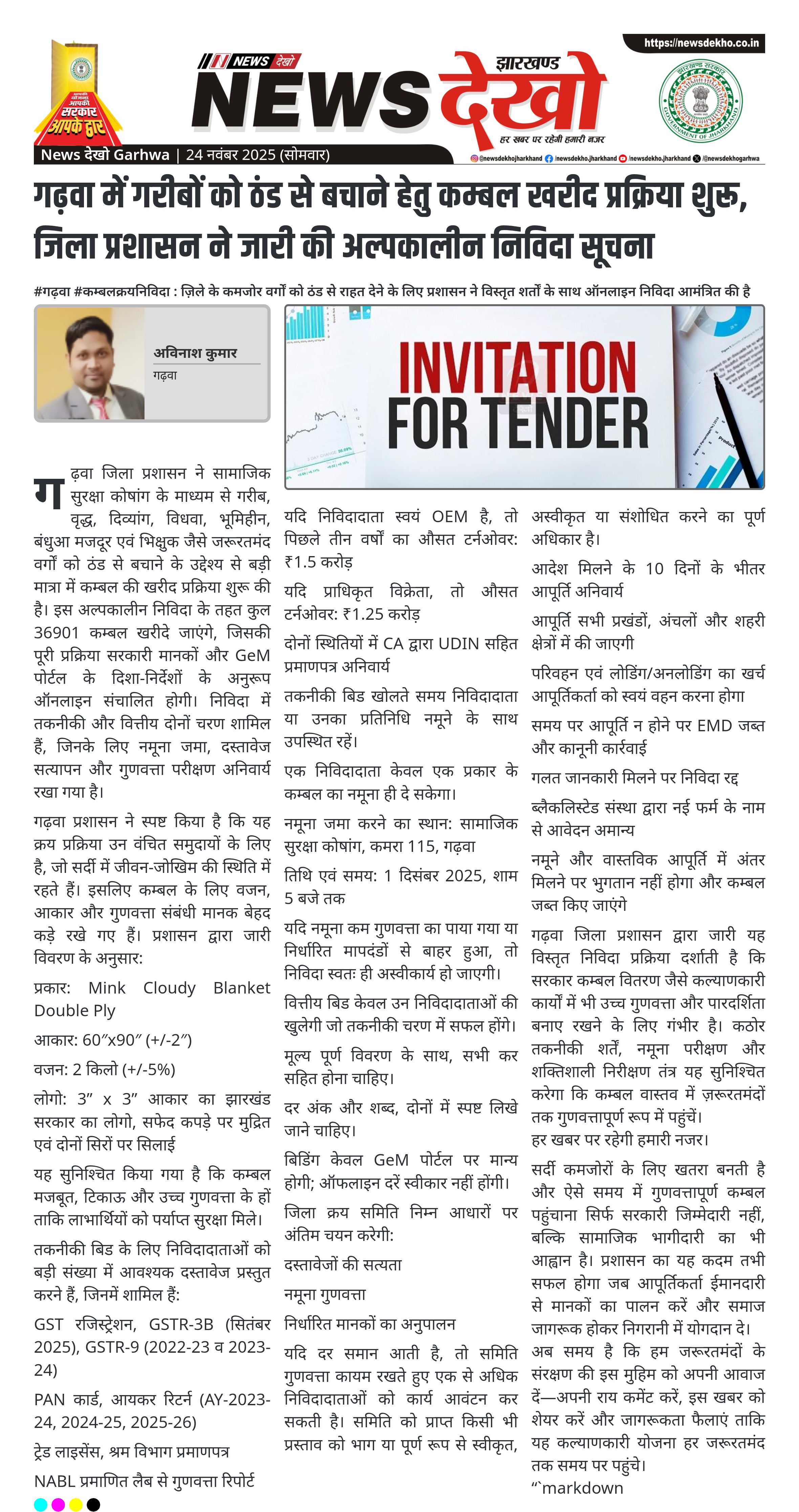 #गढ़वा #कम्बलक्रयनिविदा : ज़िले के कमजोर वर्गों को ठंड से राहत देने के लिए प्रशासन ने विस्तृत शर्तों के साथ ऑनलाइन निविदा आमंत्रित की है गढ़वा जिला प्रशासन ने वित्तीय वर्ष 2025-26 के लिए 36901 कम्बलों की खरीद हेतु निविदा जारी की। कम्बल का प्रकार Mink Cloudy Blanket Double Ply,…