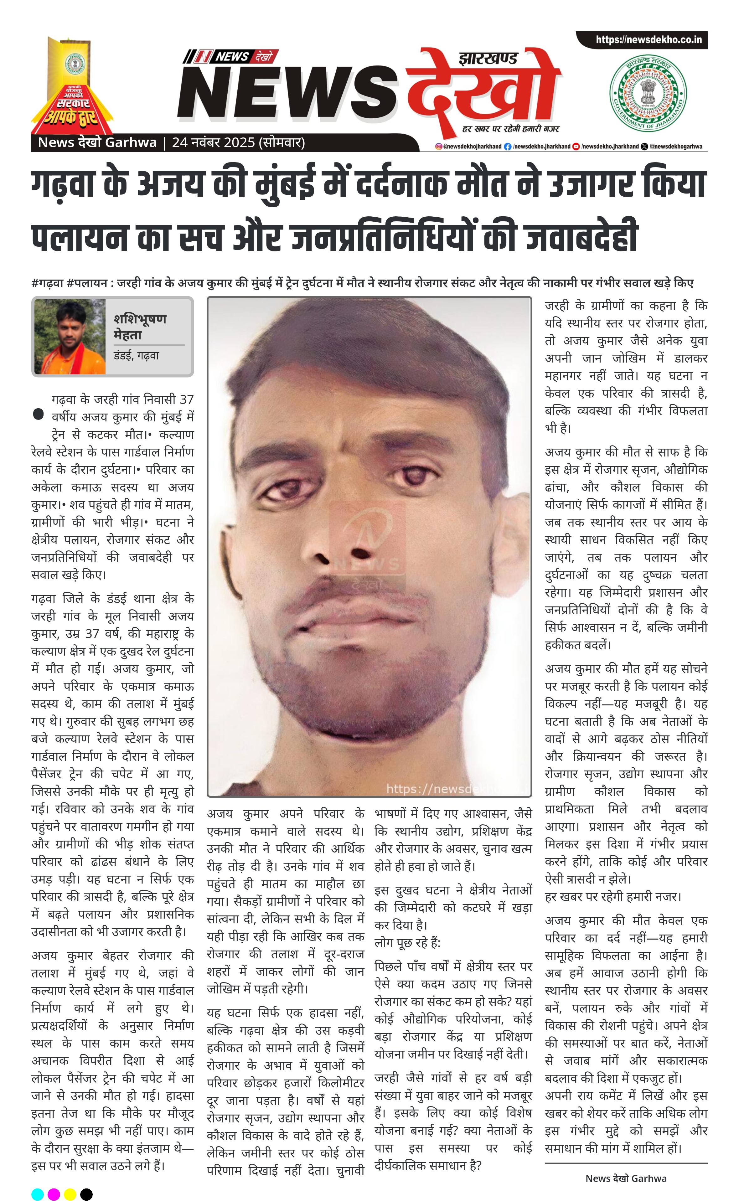 #गढ़वा #पलायन : जरही गांव के अजय कुमार की मुंबई में ट्रेन दुर्घटना में मौत ने स्थानीय रोजगार संकट और नेतृत्व की नाकामी पर गंभीर सवाल खड़े किए • गढ़वा के जरही गांव निवासी 37 वर्षीय अजय कुमार की मुंबई में ट्रेन से कटकर मौत।• कल्याण रेलवे स्टेशन के पास…