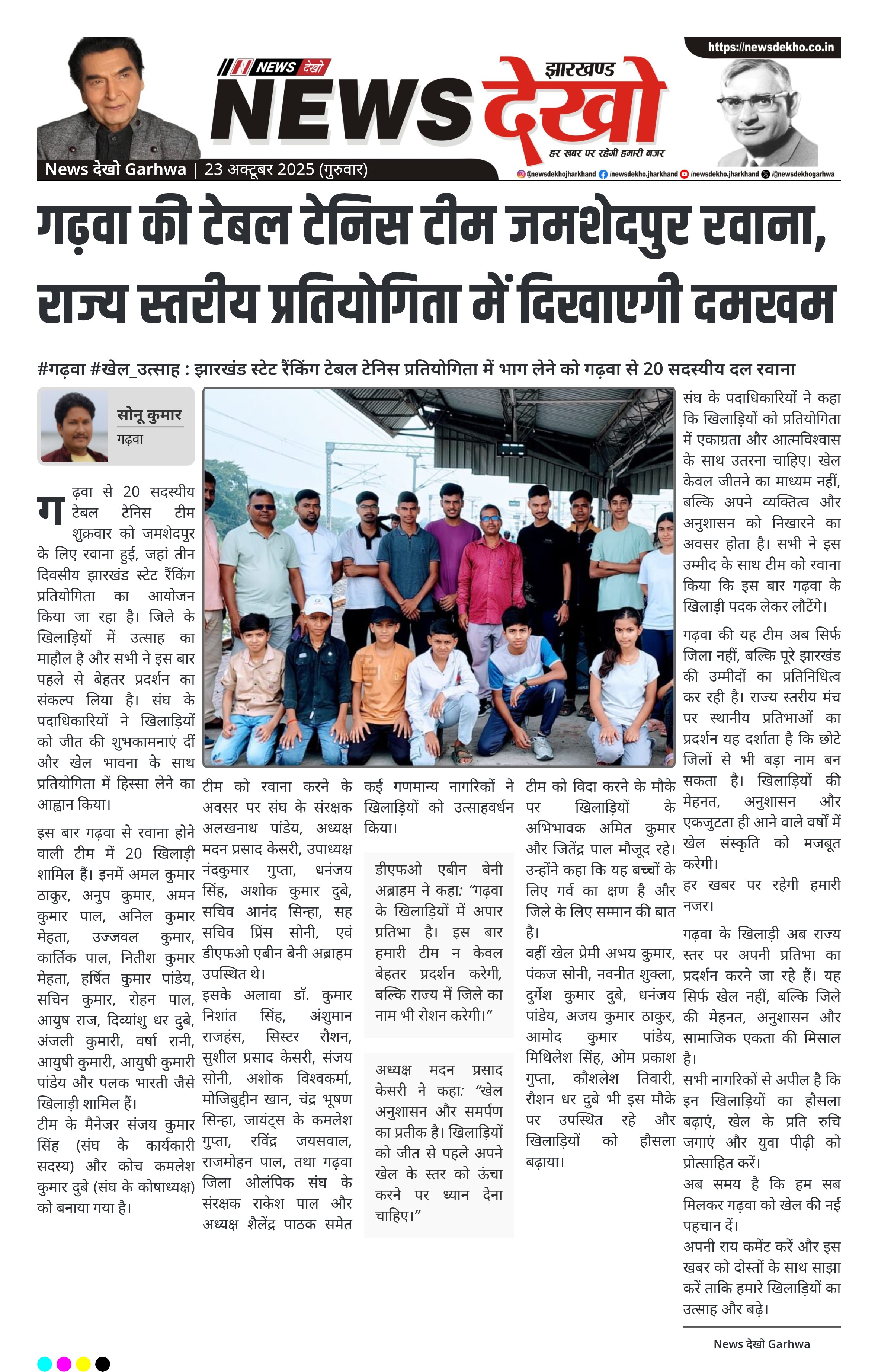 गढ़वा की टेबल टेनिस टीम जमशेदपुर रवाना, राज्य स्तरीय प्रतियोगिता में दिखाएगी दमखम