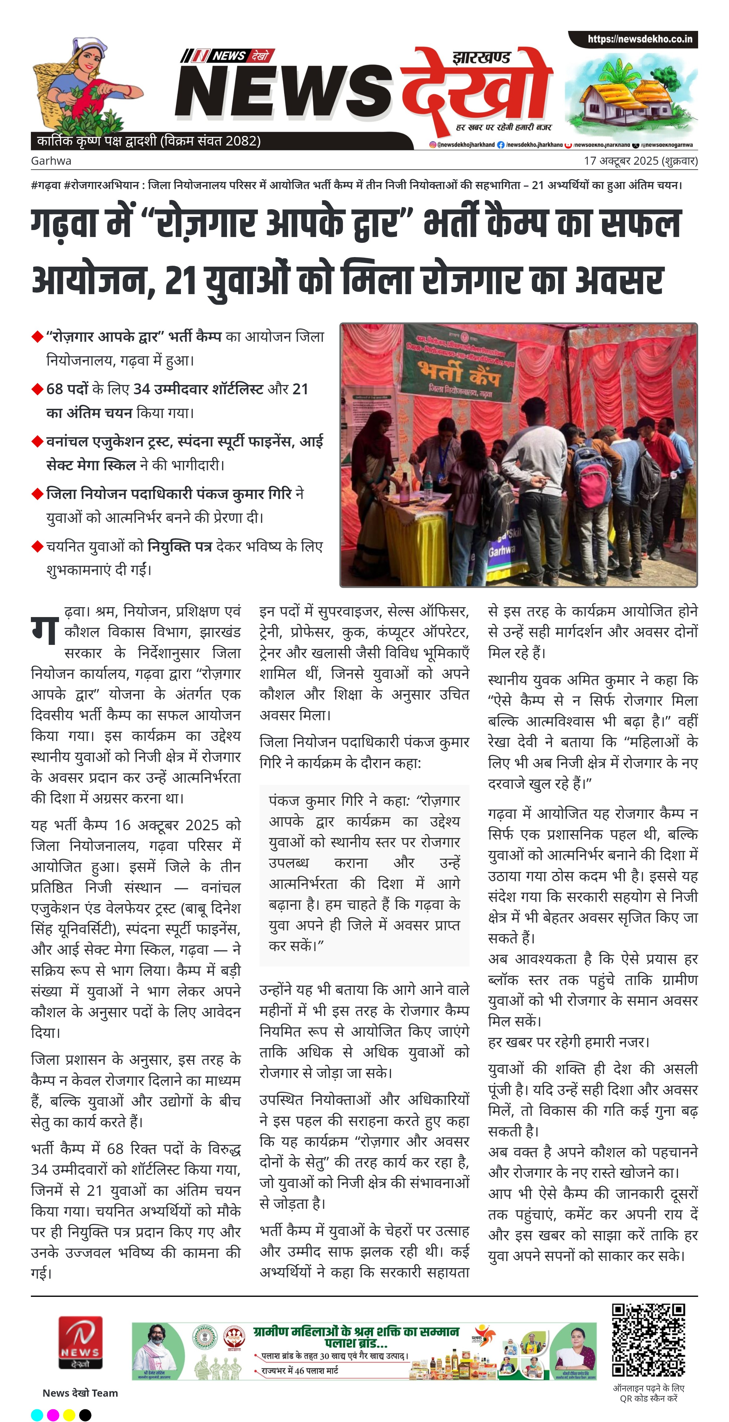 गढ़वा में “रोज़गार आपके द्वार” भर्ती कैम्प का सफल आयोजन, 21 युवाओं को मिला रोजगार का अवसर