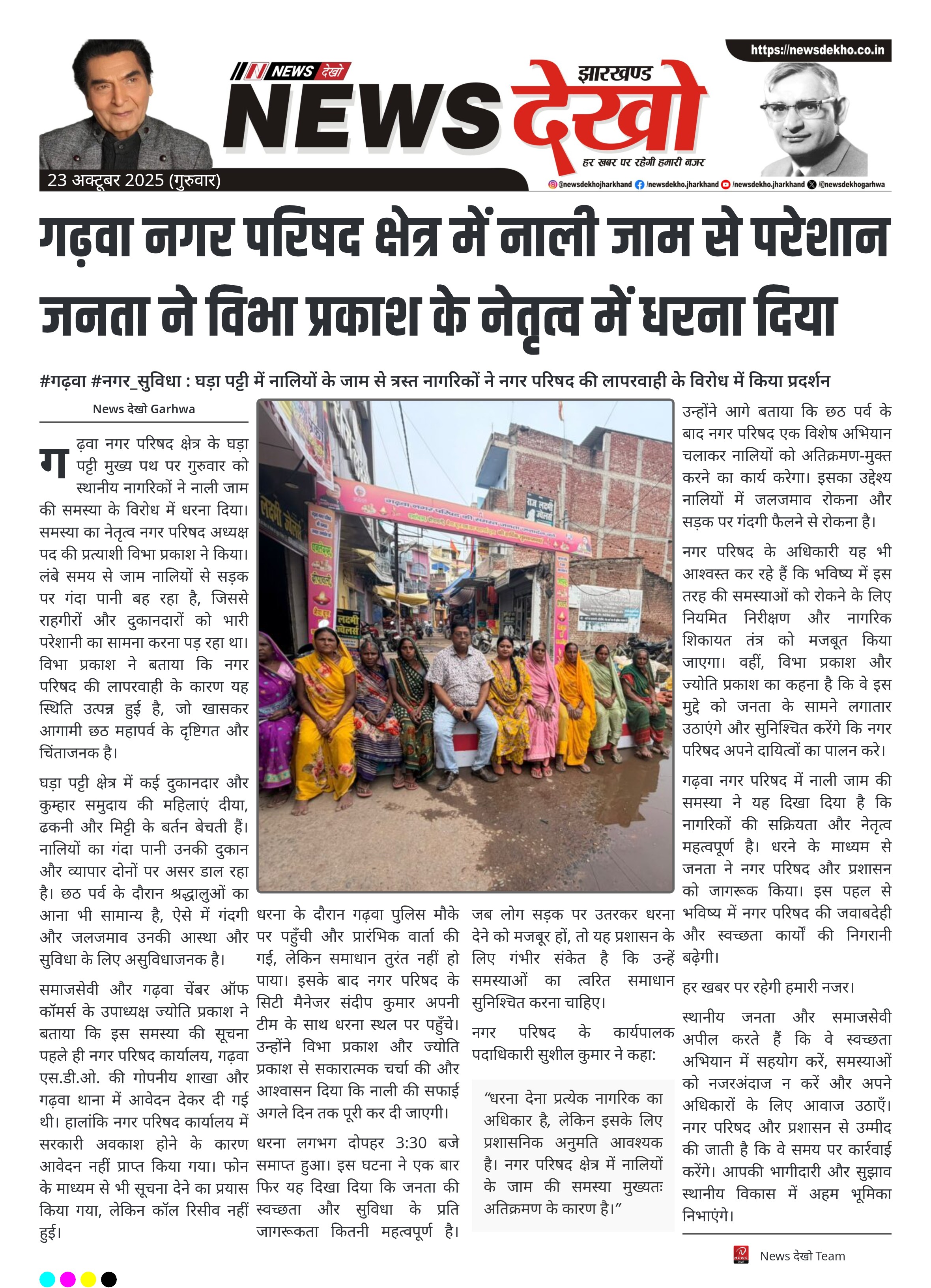 #गढ़वा #नगर_सुविधा : घड़ा पट्टी में नालियों के जाम से त्रस्त नागरिकों ने नगर परिषद की लापरवाही के विरोध में किया प्रदर्शन घड़ा पट्टी मुख्य पथ पर नाली जाम की समस्या के विरोध में धरना। नगर परिषद अध्यक्ष पद की प्रत्याशी विभा प्रकाश ने धरना का नेतृत्व किया। ज्योति प्रकाश,…