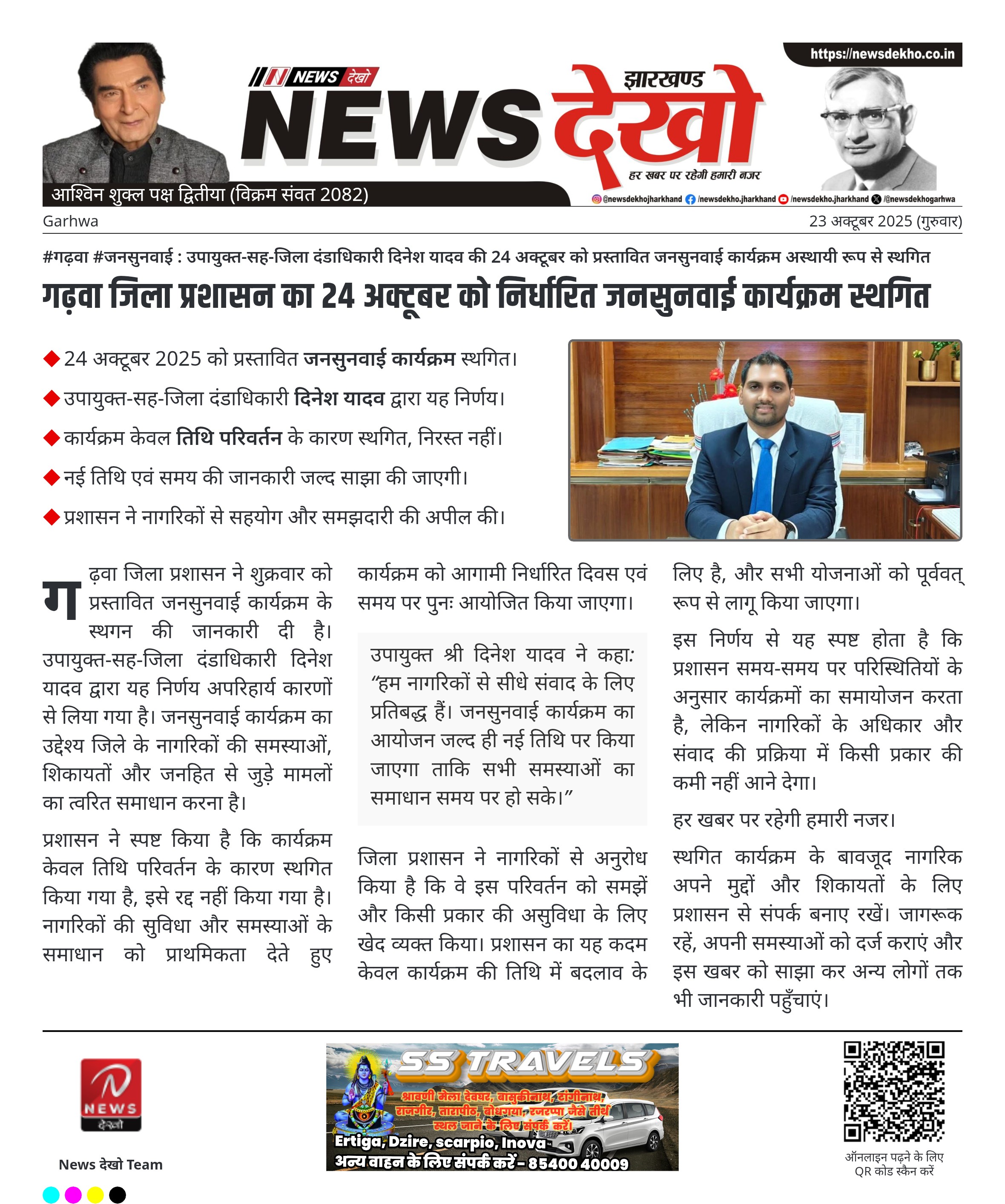 #गढ़वा #जनसुनवाई : उपायुक्त-सह-जिला दंडाधिकारी दिनेश यादव की 24 अक्टूबर को प्रस्तावित जनसुनवाई कार्यक्रम अस्थायी रूप से स्थगित 24 अक्टूबर 2025 को प्रस्तावित जनसुनवाई कार्यक्रम स्थगित। उपायुक्त-सह-जिला दंडाधिकारी दिनेश यादव द्वारा यह निर्णय। कार्यक्रम केवल तिथि परिवर्तन के कारण स्थगित, निरस्त नहीं। नई तिथि एवं समय की जानकारी जल्द साझा…