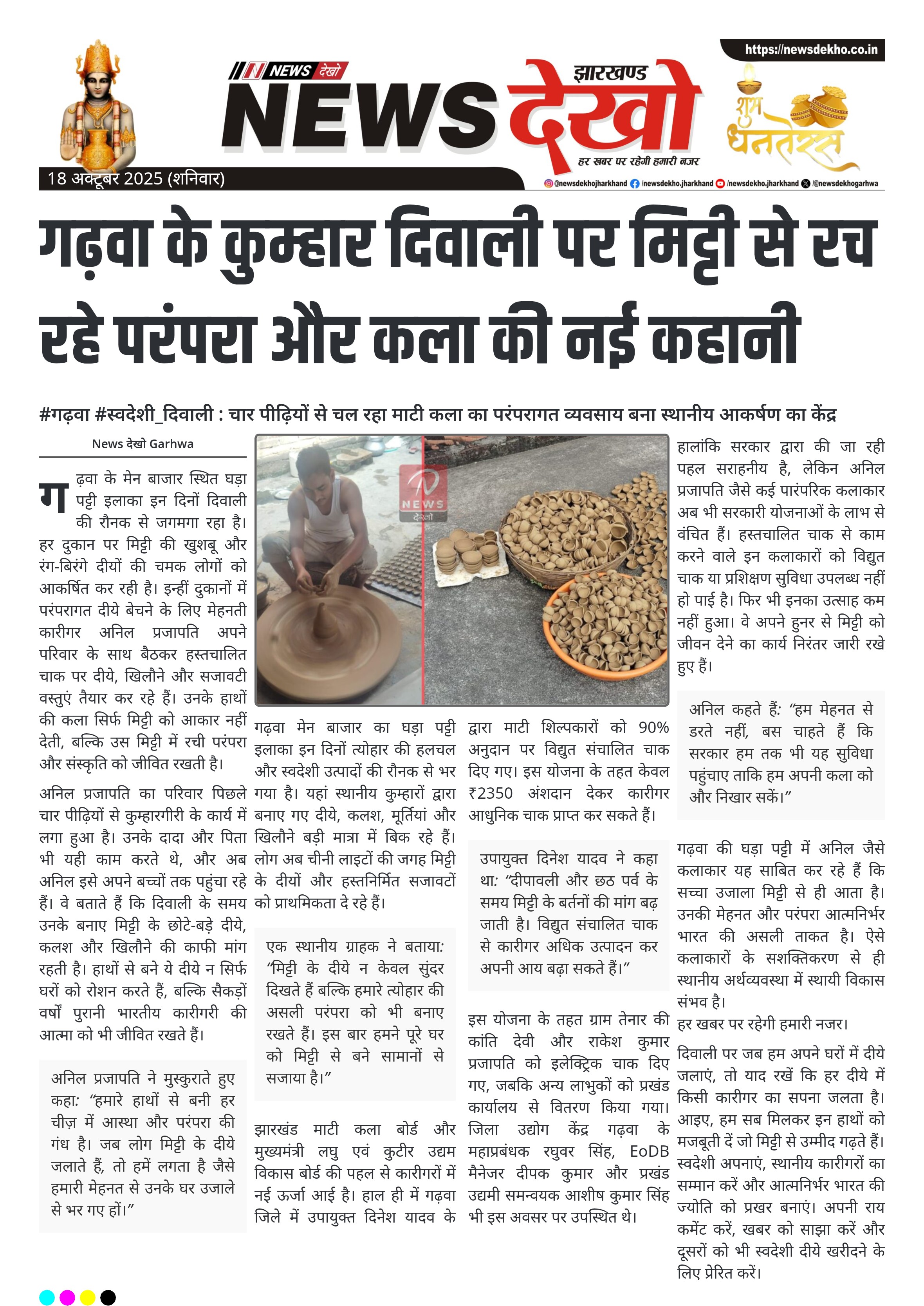 #गढ़वा #दीपोत्सव : स्थानीय कुम्हारों को मिला मंच, परंपरा और पर्यावरण संरक्षण का संदेश गोविंद हाई स्कूल मैदान में शनिवार को मृदा शिल्प दीपोत्सव का हुआ शुभारंभ। कार्यक्रम का उद्घाटन उप विकास आयुक्त पशुपतिनाथ मिश्र, एसडीएम संजय कुमार और अन्य अधिकारियों ने किया। मिट्टी के दीयों, खिलौनों और सजावटी वस्तुओं…