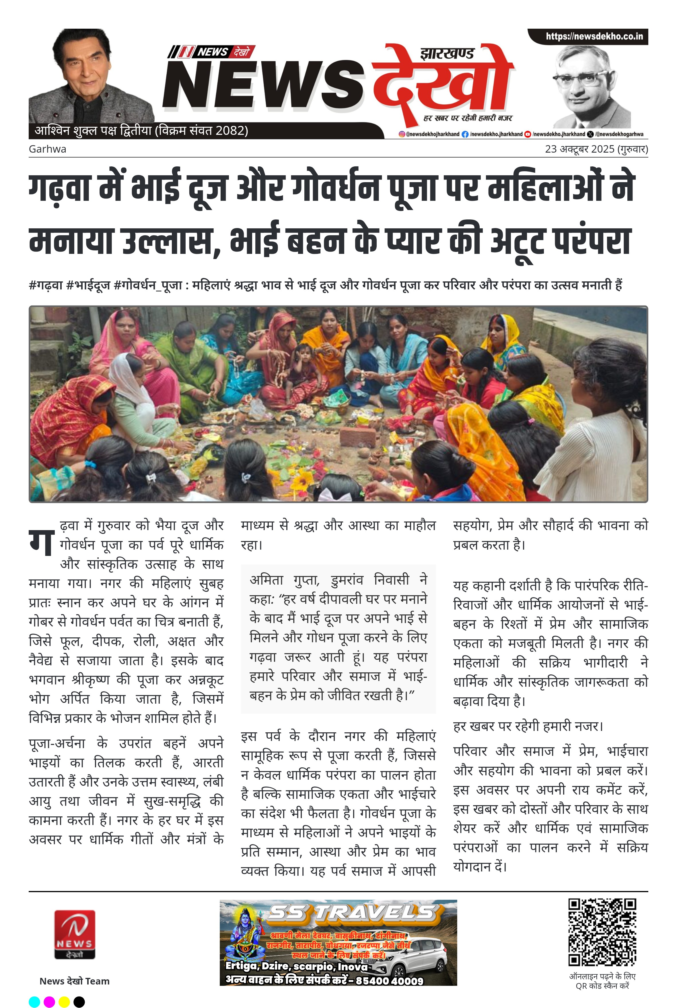 #गढ़वा #भाईदूज #गोवर्धन_पूजा : महिलाएं श्रद्धा भाव से भाई दूज और गोवर्धन पूजा कर परिवार और परंपरा का उत्सव मनाती हैं गढ़वा में भैया दूज और गोवर्धन पूजा का पर्व पूरे श्रद्धा और उल्लास के साथ मनाया गया। नगर की सभी महिलाओं और बहनों ने अपने भाइयों की दीर्घायु, सुख-समृद्धि…