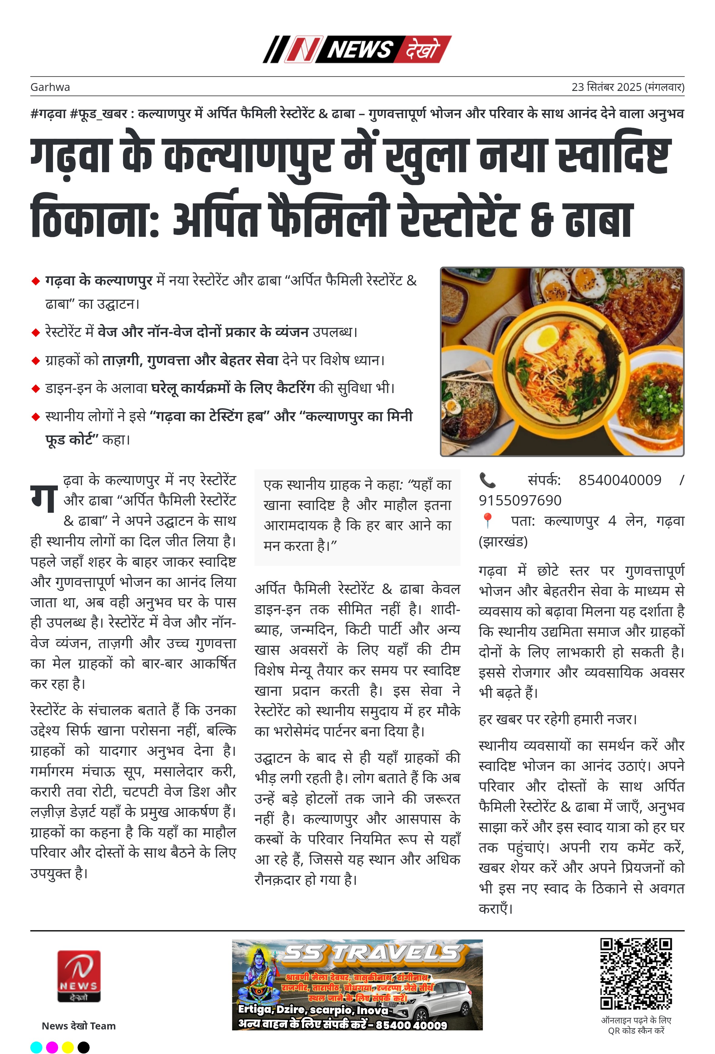 गढ़वा के कल्याणपुर में खुला नया स्वादिष्ट ठिकाना: अर्पित फैमिली रेस्टोरेंट & ढाबा