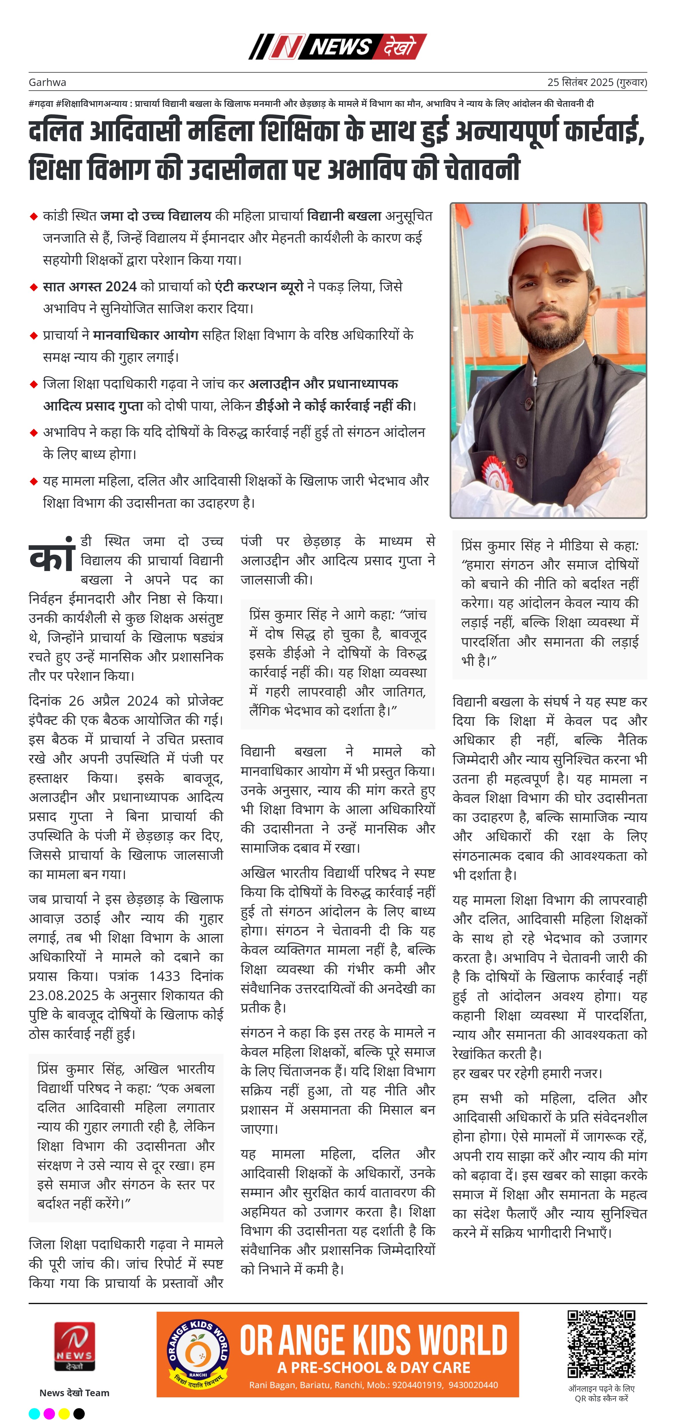 #गढ़वा #शिक्षाविभागअन्याय : प्राचार्या विद्यानी बखला के खिलाफ मनमानी और छेड़छाड़ के मामले में विभाग का मौन, अभाविप ने न्याय के लिए आंदोलन की चेतावनी दी कांडी स्थित जमा दो उच्च विद्यालय की महिला प्राचार्या विद्यानी बखला अनुसूचित जनजाति से हैं, जिन्हें विद्यालय में ईमानदार और मेहनती कार्यशैली के कारण…