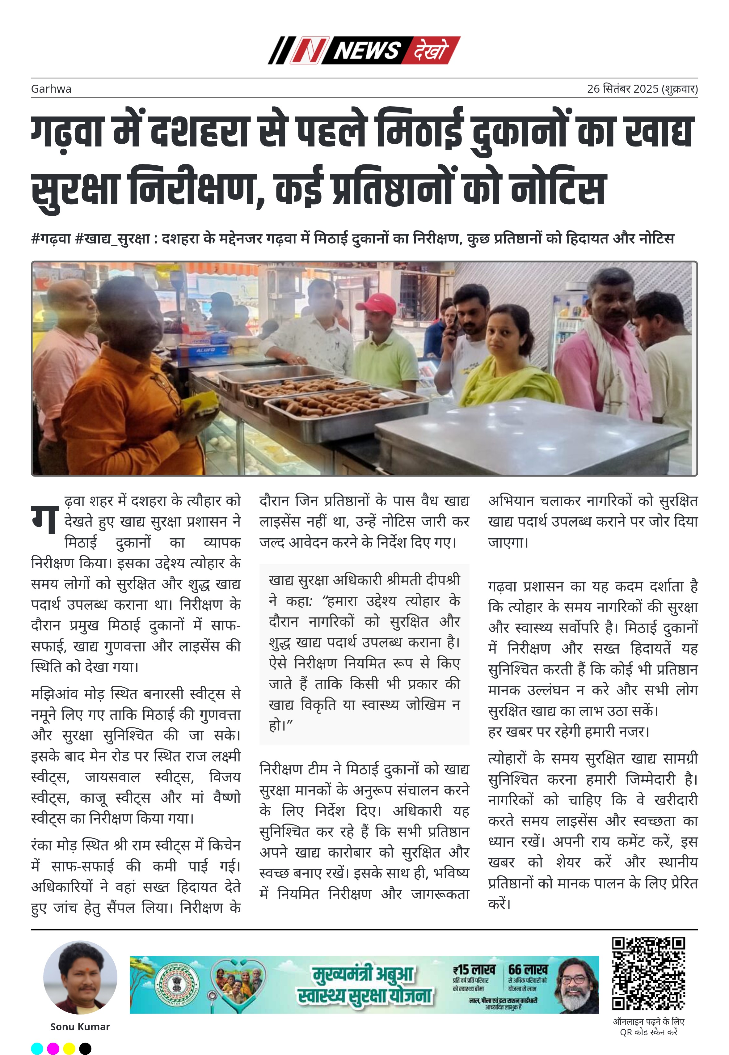 #गढ़वा #खाद्य_सुरक्षा : दशहरा के मद्देनजर गढ़वा में मिठाई दुकानों का निरीक्षण, कुछ प्रतिष्ठानों को हिदायत और नोटिस 26.09.2025 को गढ़वा शहर में मिठाई दुकानों का खाद्य सुरक्षा एवं मानक अधिनियम 2006 के तहत निरीक्षण। मझिआंव मोड़ स्थित बनारसी स्वीट्स से सैंपल लिए गए। मेन रोड स्थित राज लक्ष्मी स्वीट्स,…