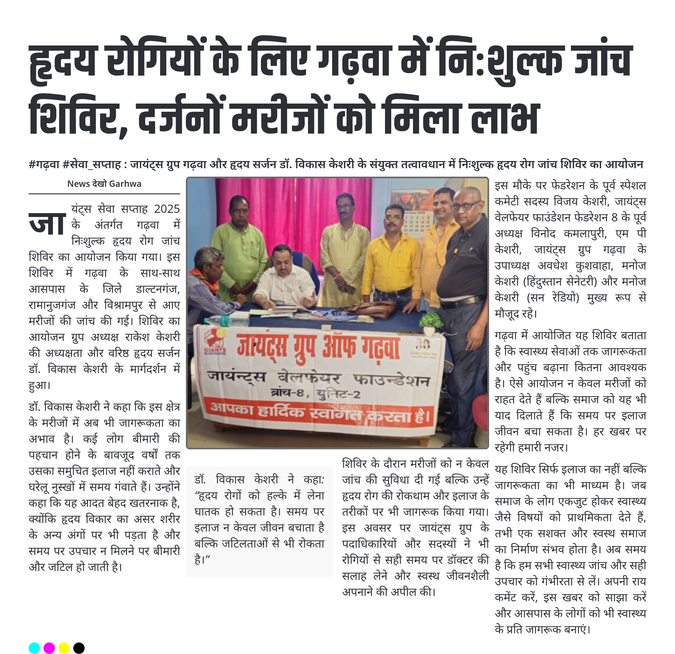 #गढ़वा #सेवा_सप्ताह : जायंट्स ग्रुप गढ़वा और हृदय सर्जन डॉ. विकास केशरी के संयुक्त तत्वावधान में निःशुल्क हृदय रोग जांच शिविर का आयोजन स्थान: गढ़वा, जायंट्स सेवा सप्ताह 2025 के तहत आयोजन। नेतृत्व: ग्रुप अध्यक्ष राकेश केशरी की अध्यक्षता। मुख्य सहयोगी: हृदय सर्जन डॉ. विकास केशरी। भागीदारी: गढ़वा, डाल्टनगंज, रामानुजगंज…