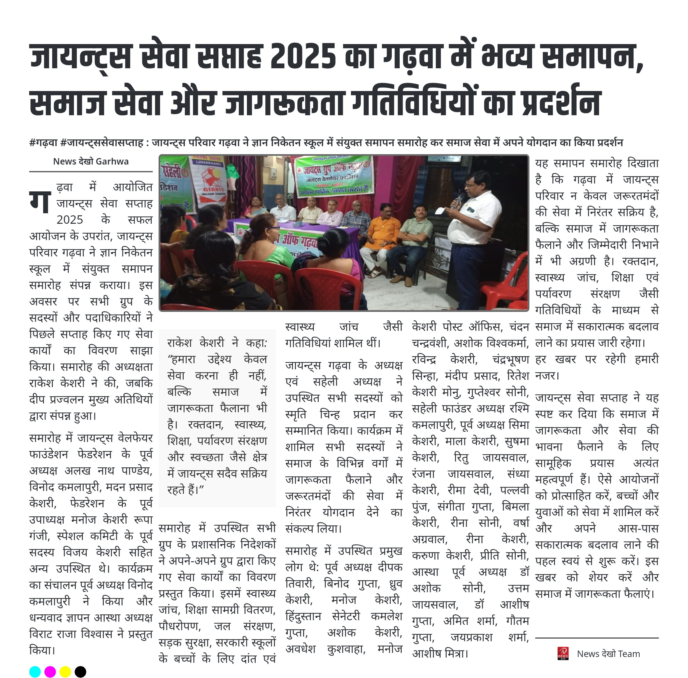 जायन्ट्स सेवा सप्ताह 2025 का गढ़वा में भव्य समापन, समाज सेवा और जागरूकता गतिविधियों का प्रदर्शन