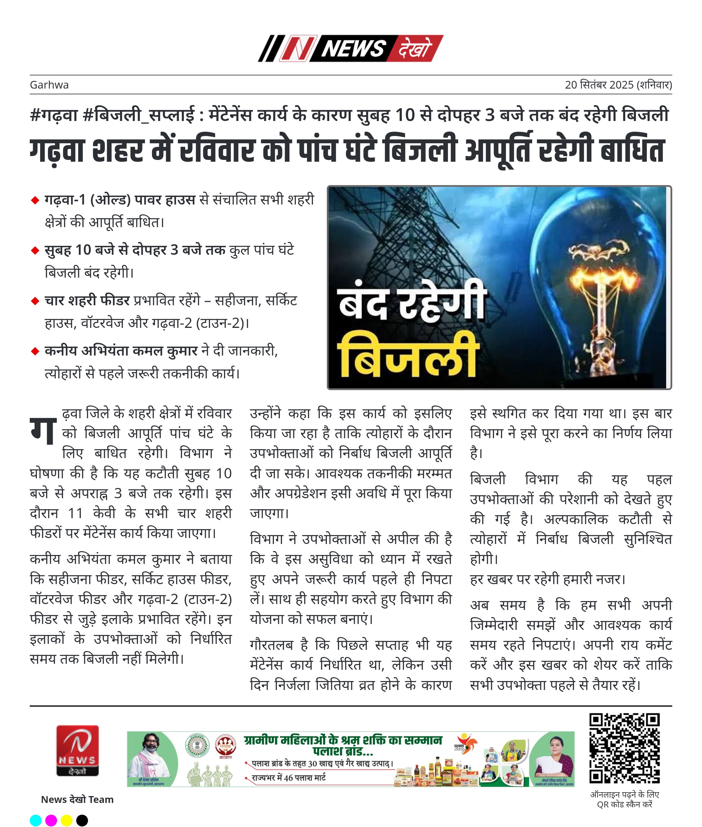 #गढ़वा #बिजली_सप्लाई : मेंटेनेंस कार्य के कारण सुबह 10 से दोपहर 3 बजे तक बंद रहेगी बिजली गढ़वा-1 (ओल्ड) पावर हाउस से संचालित सभी शहरी क्षेत्रों की आपूर्ति बाधित। सुबह 10 बजे से दोपहर 3 बजे तक कुल पांच घंटे बिजली बंद रहेगी। चार शहरी फीडर प्रभावित रहेंगे – सहीजना,…