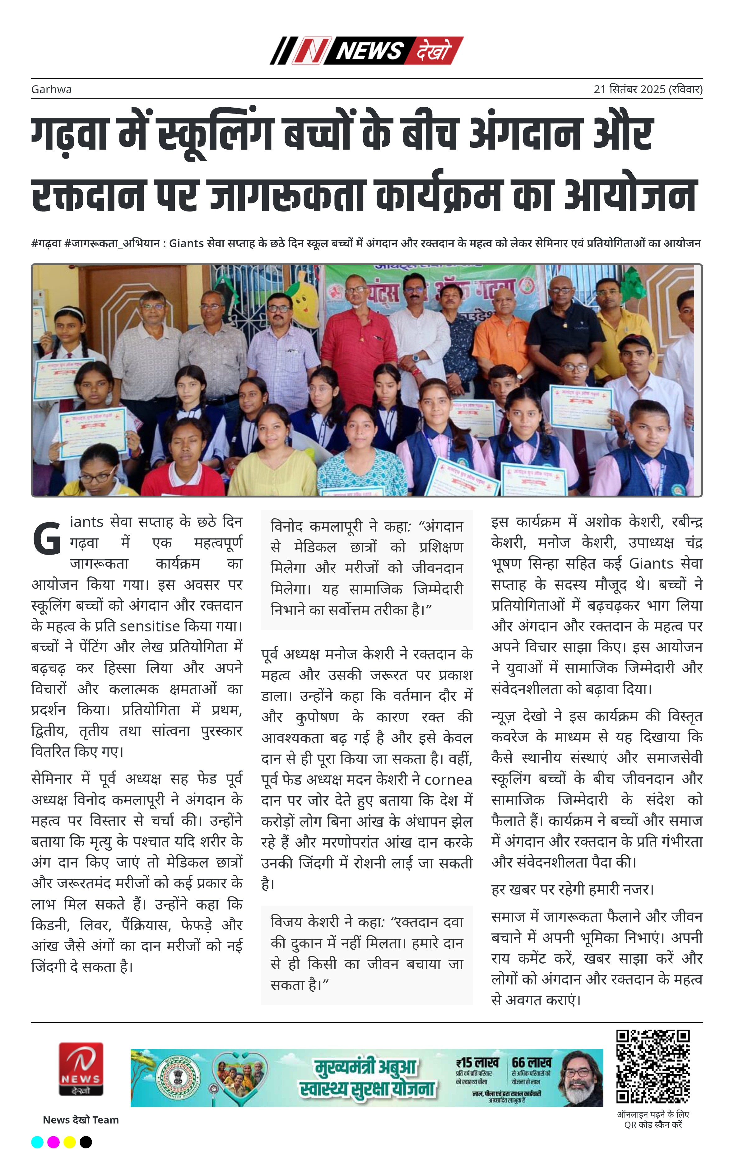 गढ़वा में स्कूलिंग बच्चों के बीच अंगदान और रक्तदान पर जागरूकता कार्यक्रम का आयोजन