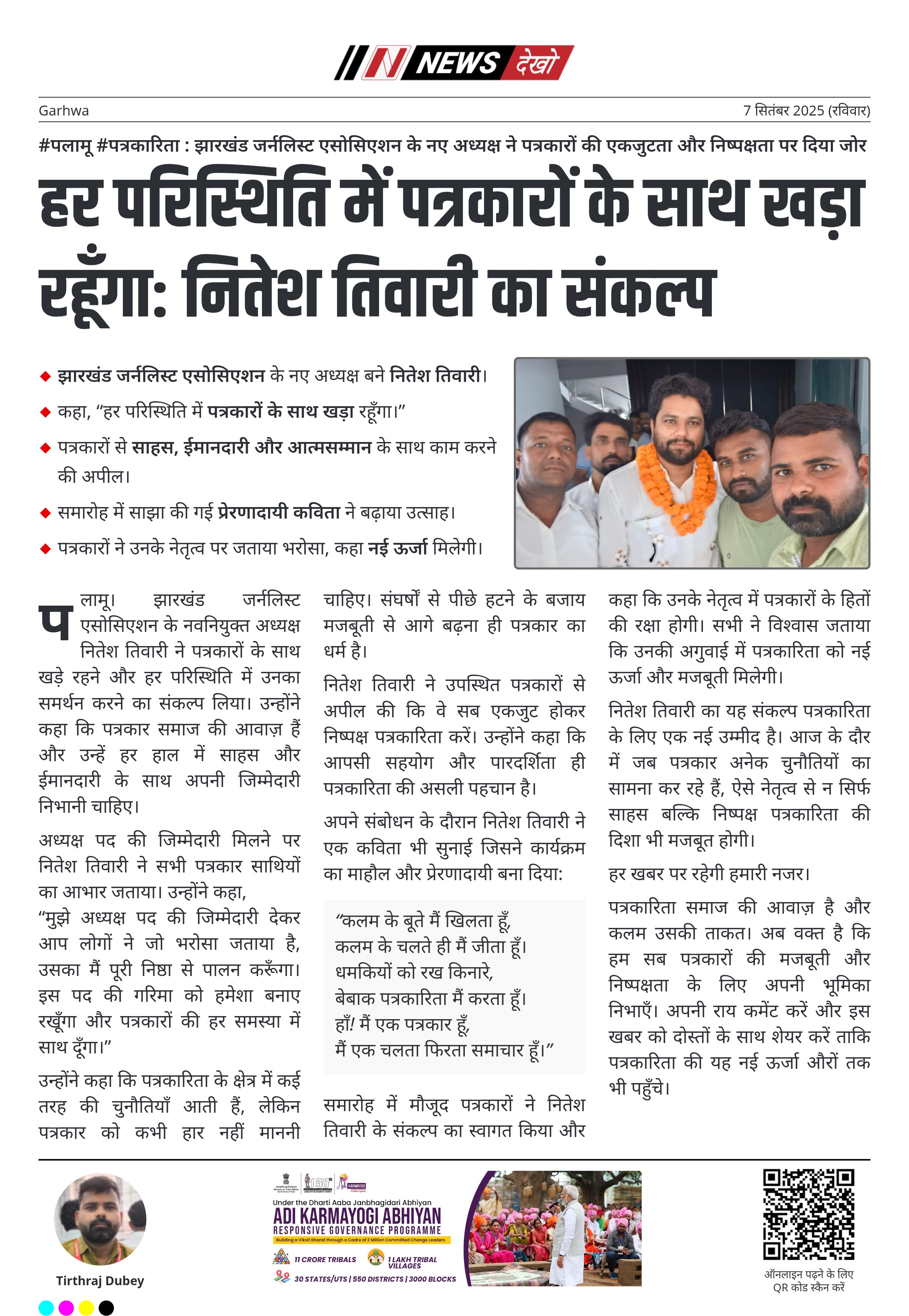 #पलामू #पत्रकारिता : झारखंड जर्नलिस्ट एसोसिएशन के नए अध्यक्ष ने पत्रकारों की एकजुटता और निष्पक्षता पर दिया जोर झारखंड जर्नलिस्ट एसोसिएशन के नए अध्यक्ष बने नितेश तिवारी। कहा, “हर परिस्थिति में पत्रकारों के साथ खड़ा रहूँगा।” पत्रकारों से साहस, ईमानदारी और आत्मसम्मान के साथ काम करने की अपील। समारोह में…