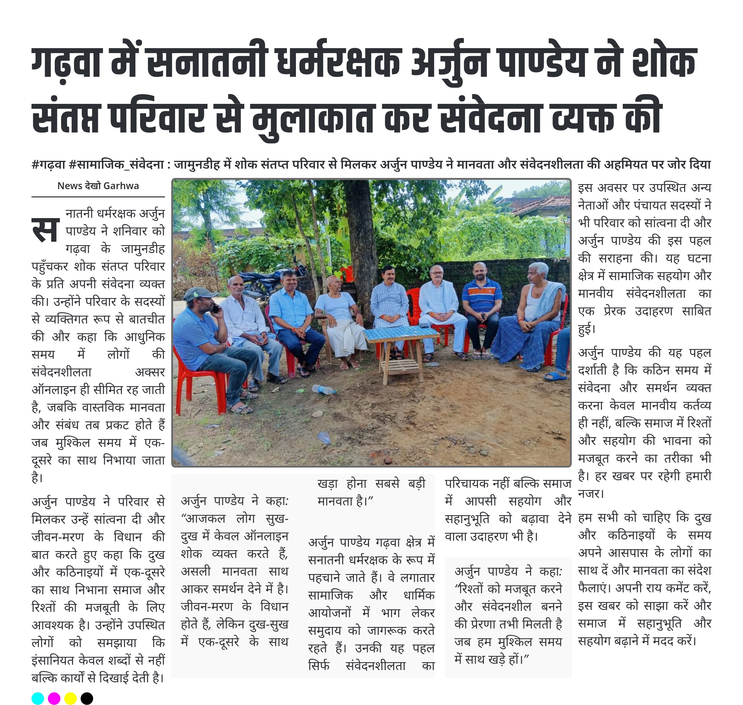 गढ़वा में सनातनी धर्मरक्षक अर्जुन पाण्डेय ने शोक संतप्त परिवार से मुलाकात कर संवेदना व्यक्त की