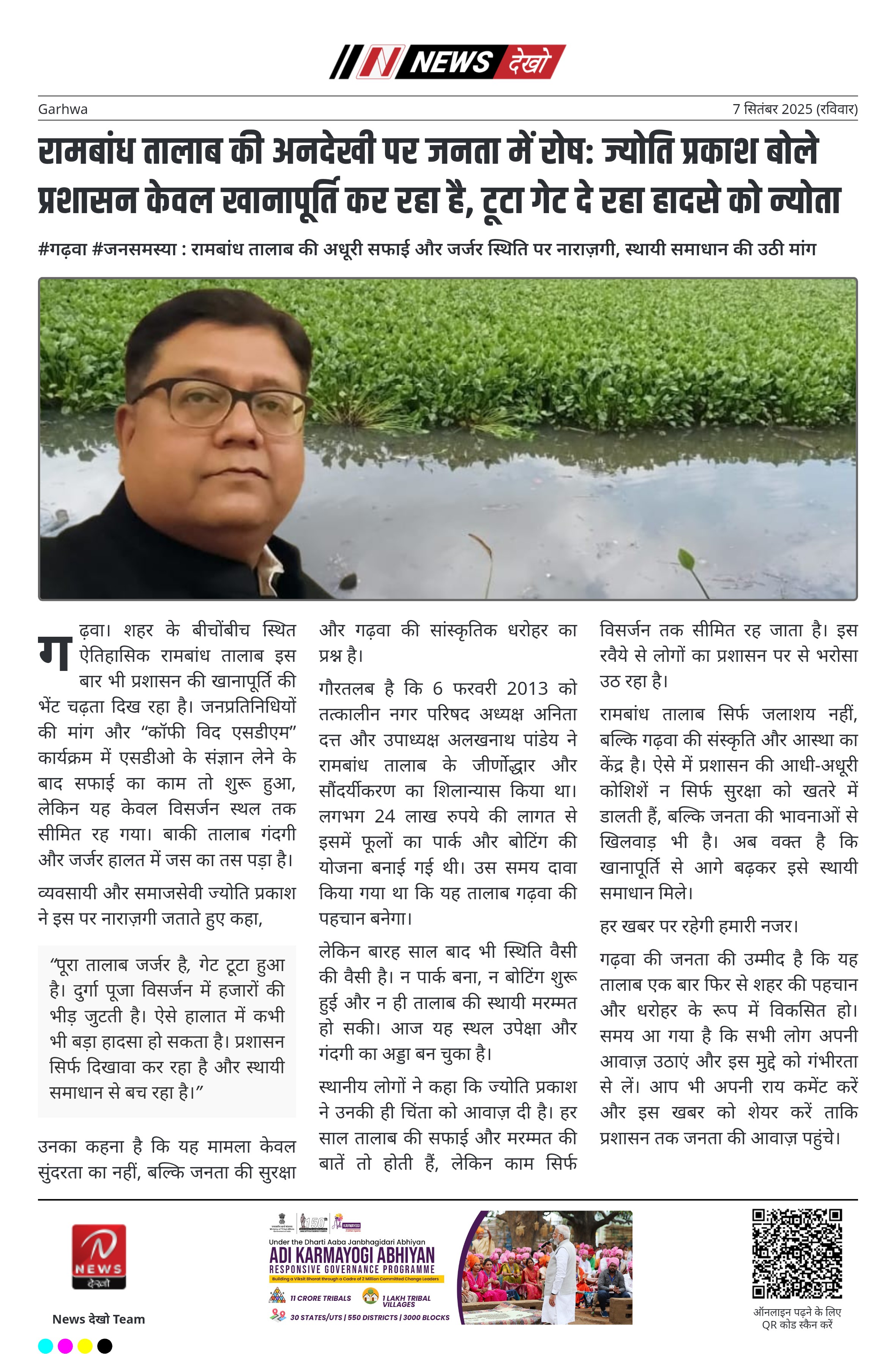 #गढ़वा #जनसमस्या : रामबांध तालाब की अधूरी सफाई और जर्जर स्थिति पर नाराज़गी, स्थायी समाधान की उठी मांग रामबांध तालाब की सफाई अधूरी, केवल विसर्जन स्थल तक सीमित। जर्जर गेट और टूट-फूट, हादसे की आशंका बढ़ी। ज्योति प्रकाश का प्रशासन पर हमला, कहा- जिम्मेदारी से बच रहा है। स्थानीय लोगों…